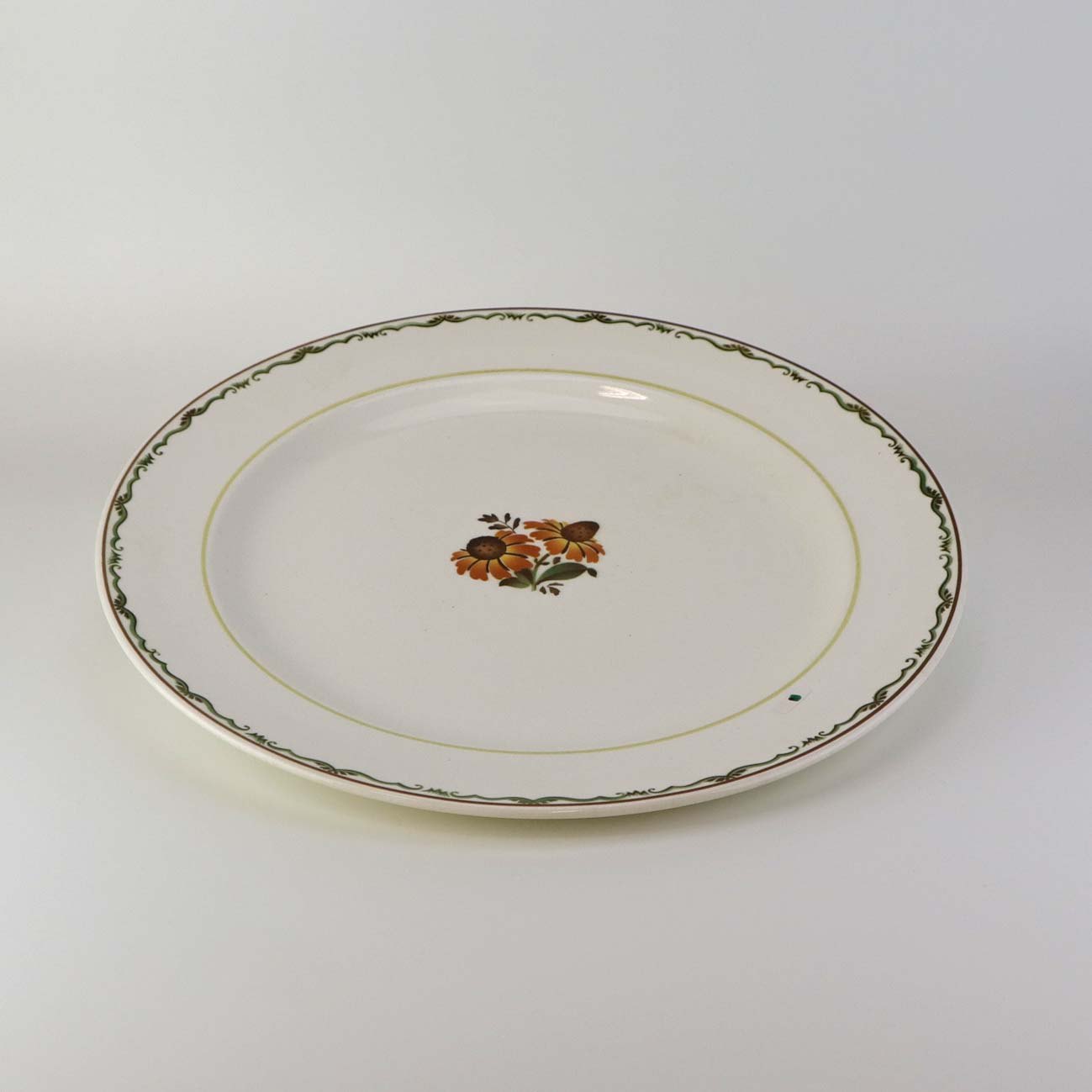 Rundt serveringsfad i fajance fra stellet Solbrud fremstillet i perioden 1937-1967Formgiver Nils Thorsson
