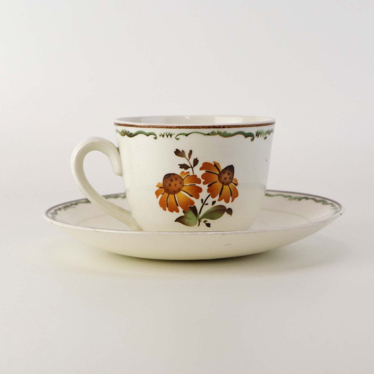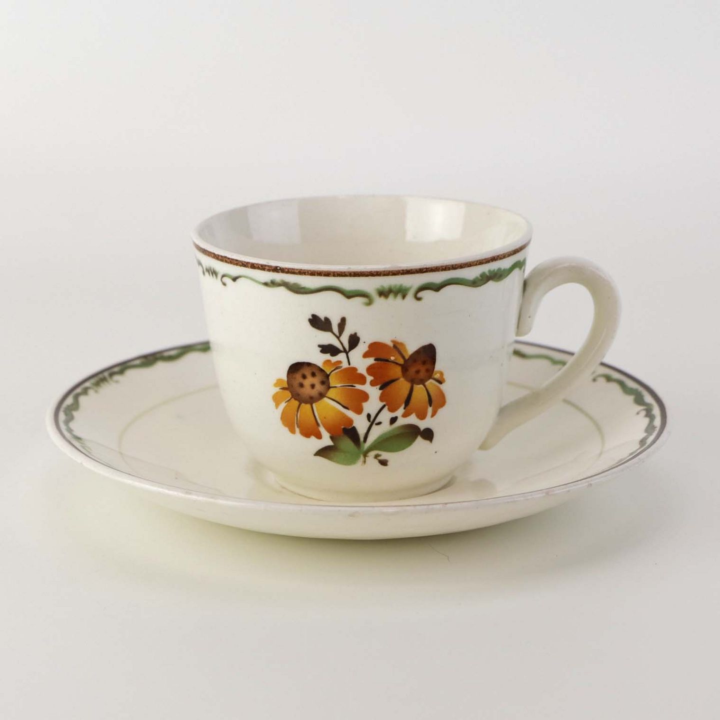 Kaffekop med underkop i fajance fra stellet Solbrud fremstillet i perioden 1937-1967. Nr. 2049Formgiver Nils Thorsson