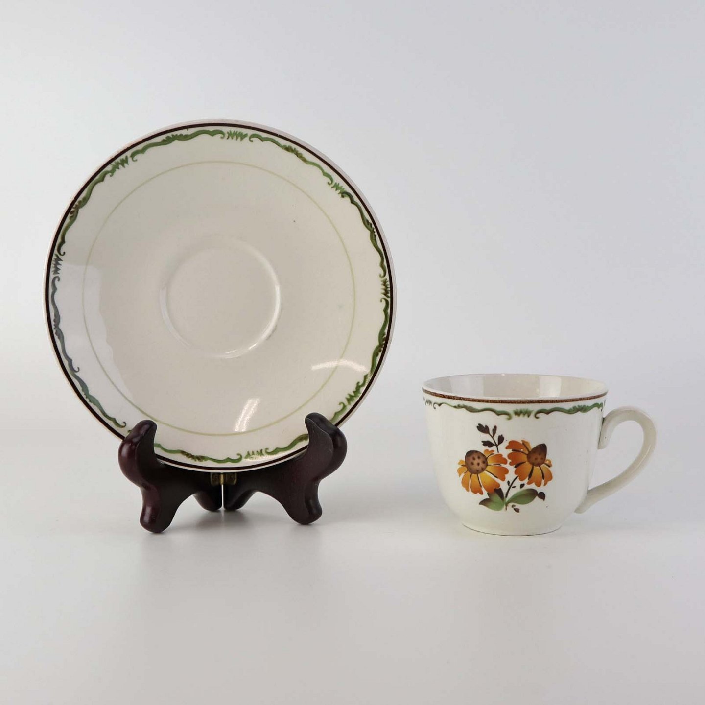 Fajancestel i stelform G med dekoration af orangegule blomster og grønne guirlander på lys baggrund med brun kant.