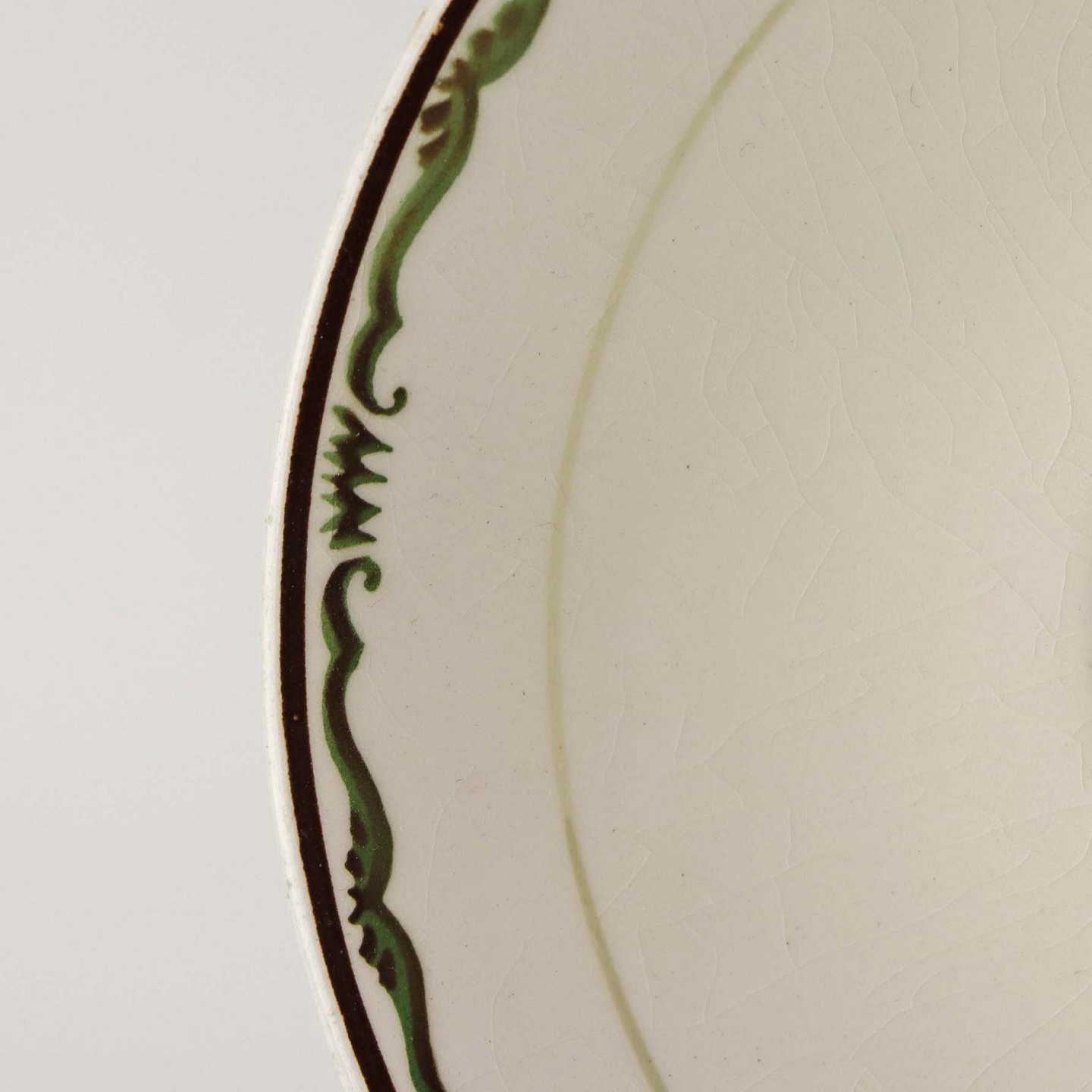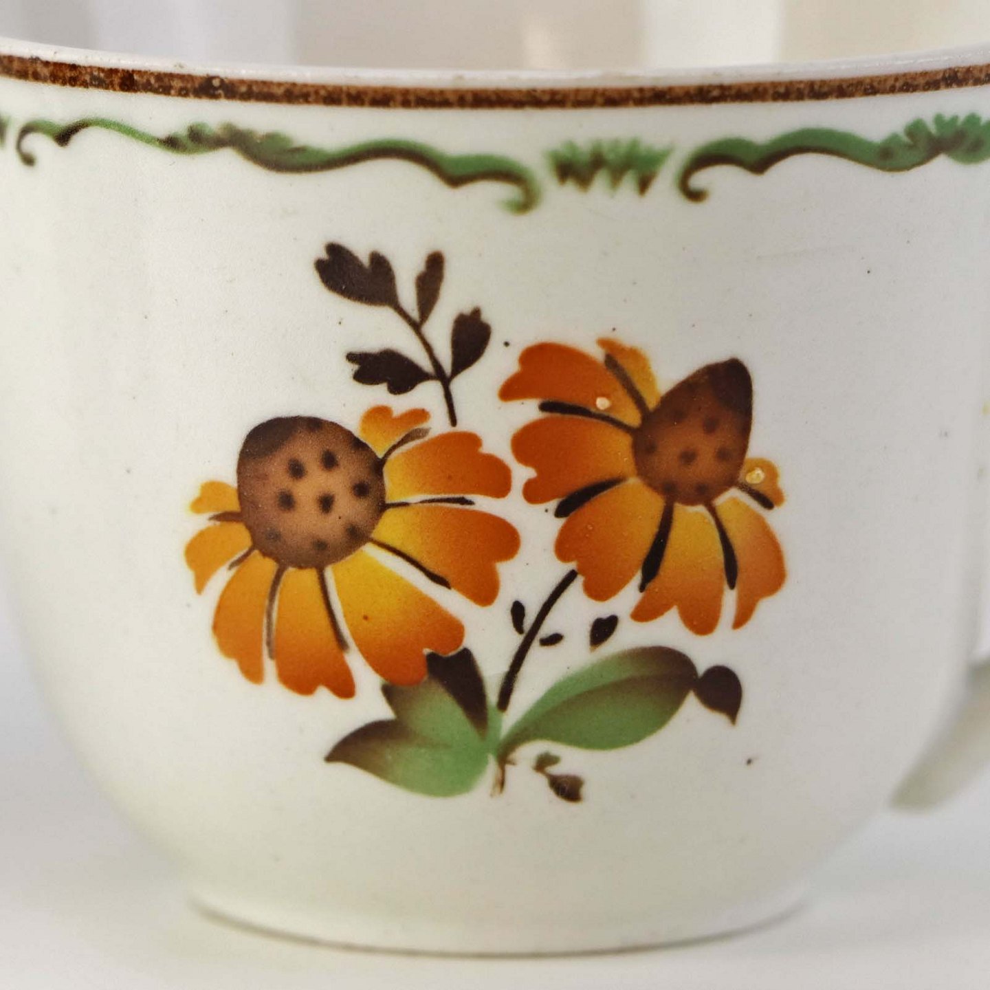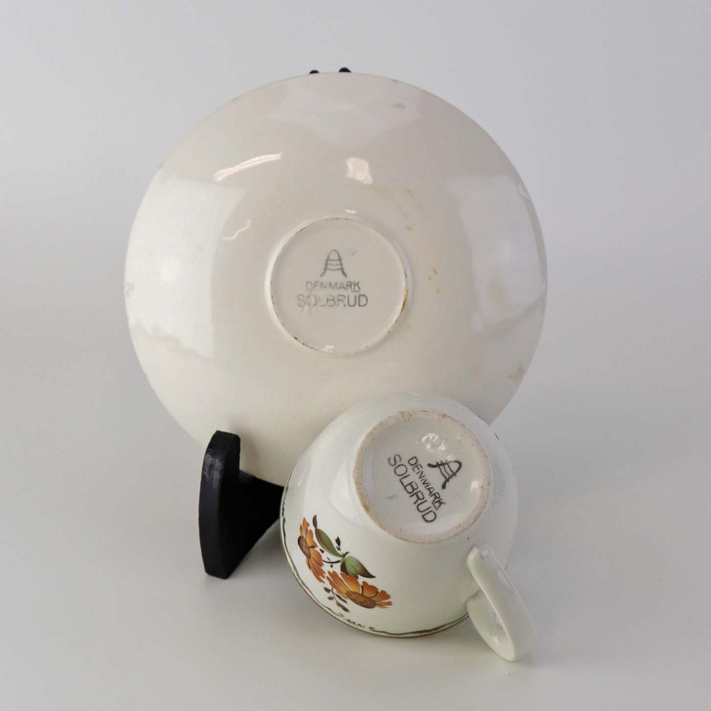 Fremstår med brugsspor på dekorationen, sorter nister og klakkeleringer i glasuren samt enkelte steder med bruneringer under glasuren på underkoppens bagside.