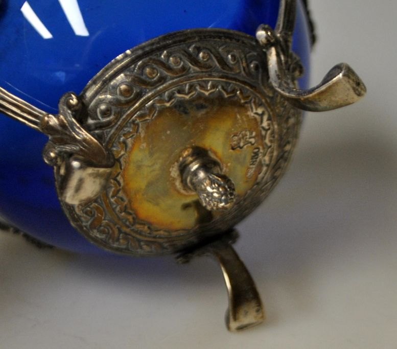 Silberne Zuckerschale mit blauem Glaseinsatz, 19. Jahrhundert.