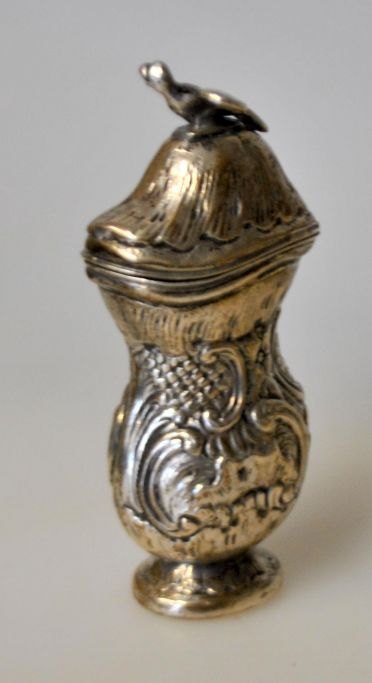 Dänischer Silberschmied (18. Jahrhundert). Rokoko Vinagrette mit Taube. Mit zahlreichen Rocaille-Verzierungen. Unpunziert. Höhe: 8,5 cm.Es scheint, als sei der Boden später ausgetauscht worden!