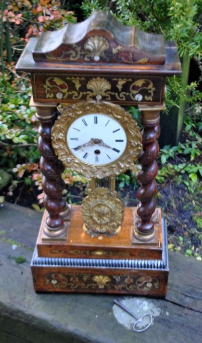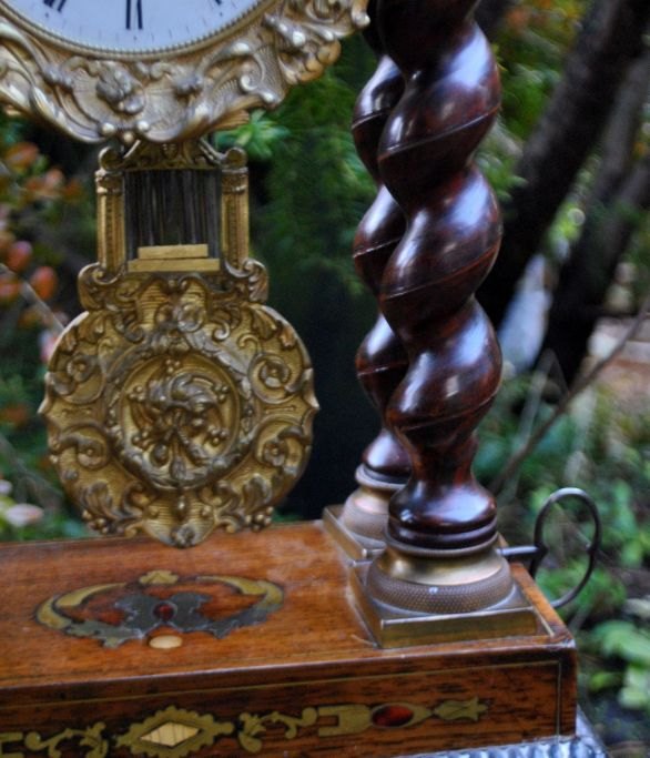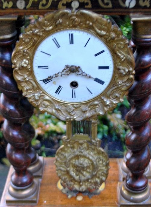 Säulenuhr aus Ebenholz, Messing und Intarsien, um 1830. Frankreich. Sockel aus Ebenholz mit Intarsien aus Messing, Schildpatt und Perlmutt. Emaille-Zifferblatt mit arabischen Ziffern. Standardwerk. Messingzeiger. Höhe: 51 cm. Breite: 24 cm.Mit Aufziehschlüssel.
