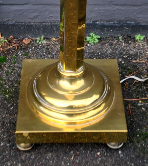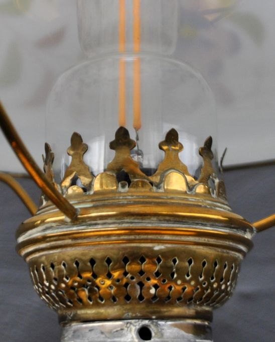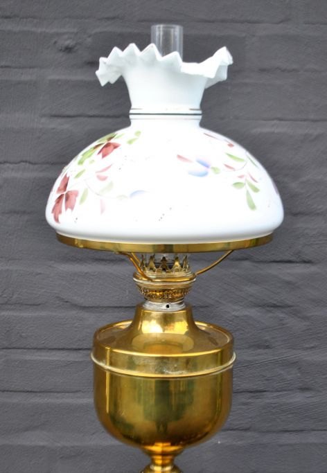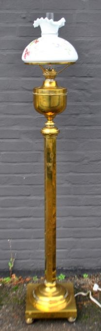 Stander Petroleumlampe, um 1900. Messing. Umgebaut auf elektrisch. Mit großer weißer Glaskuppel mit Emaille-Blumenverzierungen. Höhe: 153 cm. Schirmdurchmesser: 27 cm.Bestellnummer: 28757