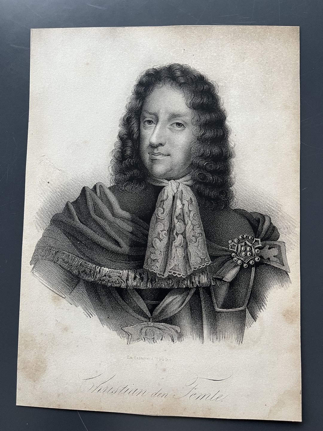 Litografi af Em. Bærentzen - Portræt af HM Kong Christian V af Danmark og Norge.