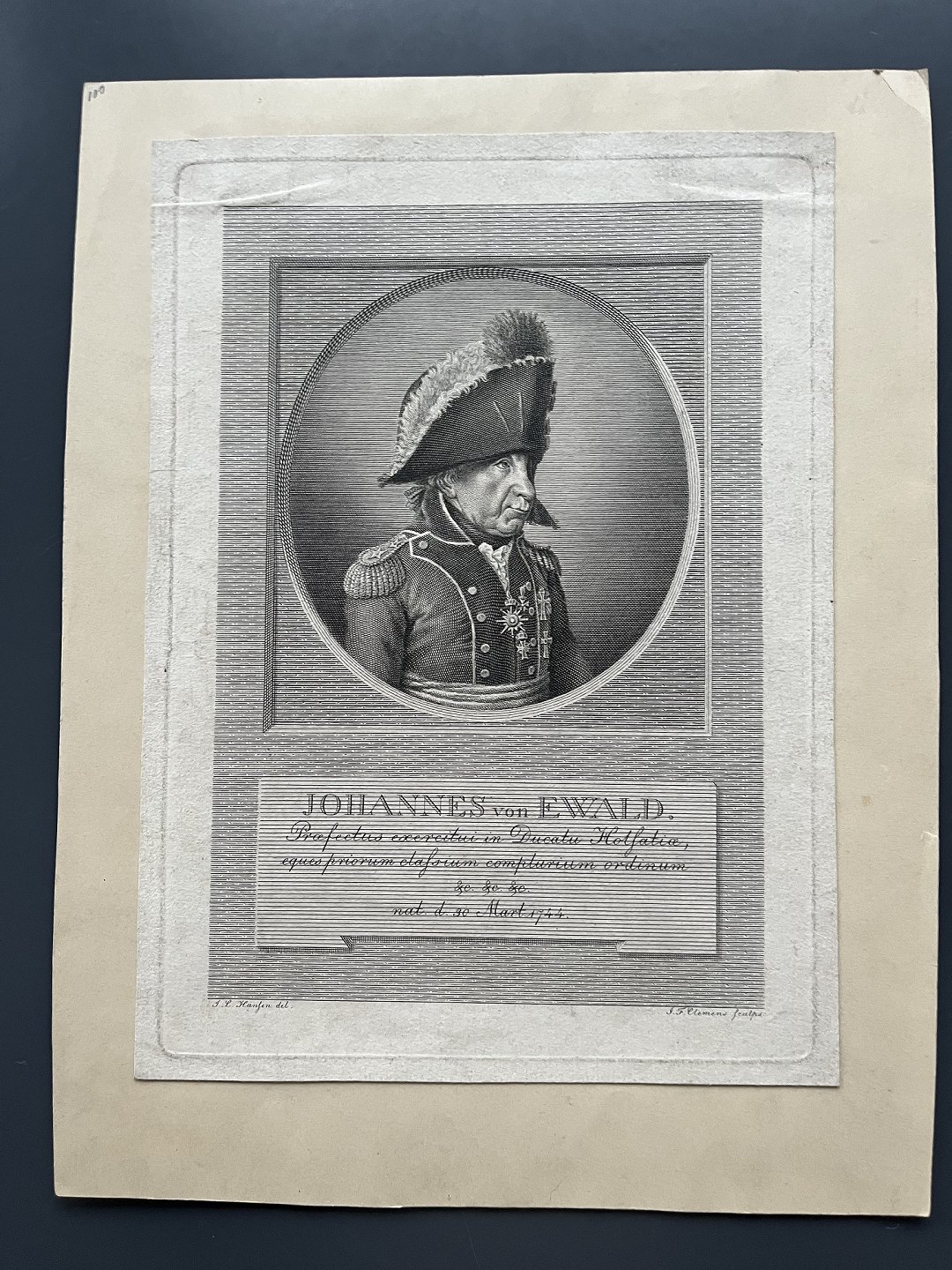 Kobberstik af J.F. Clemens - Portræt af Generalløjtnant Johann von Ewald.