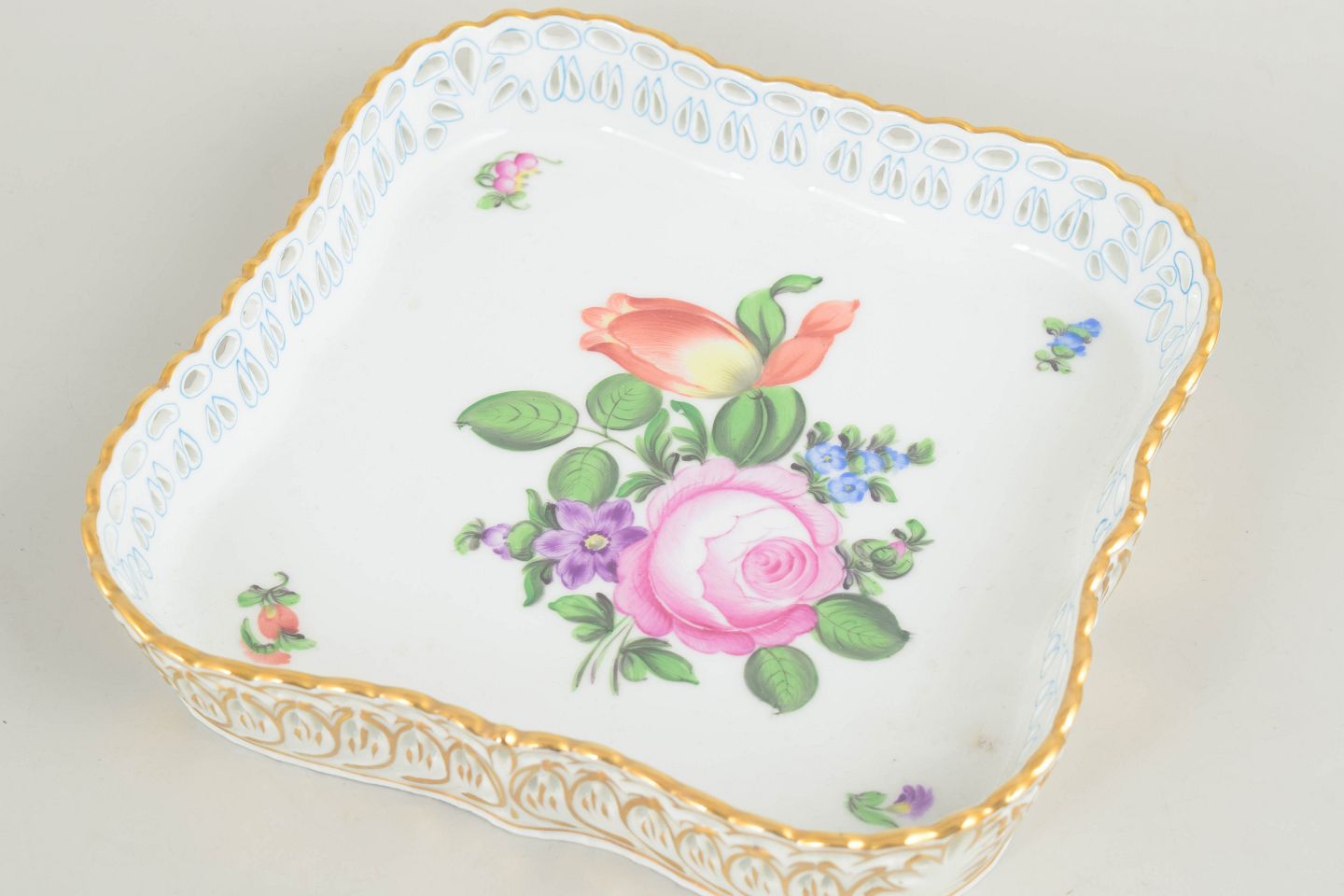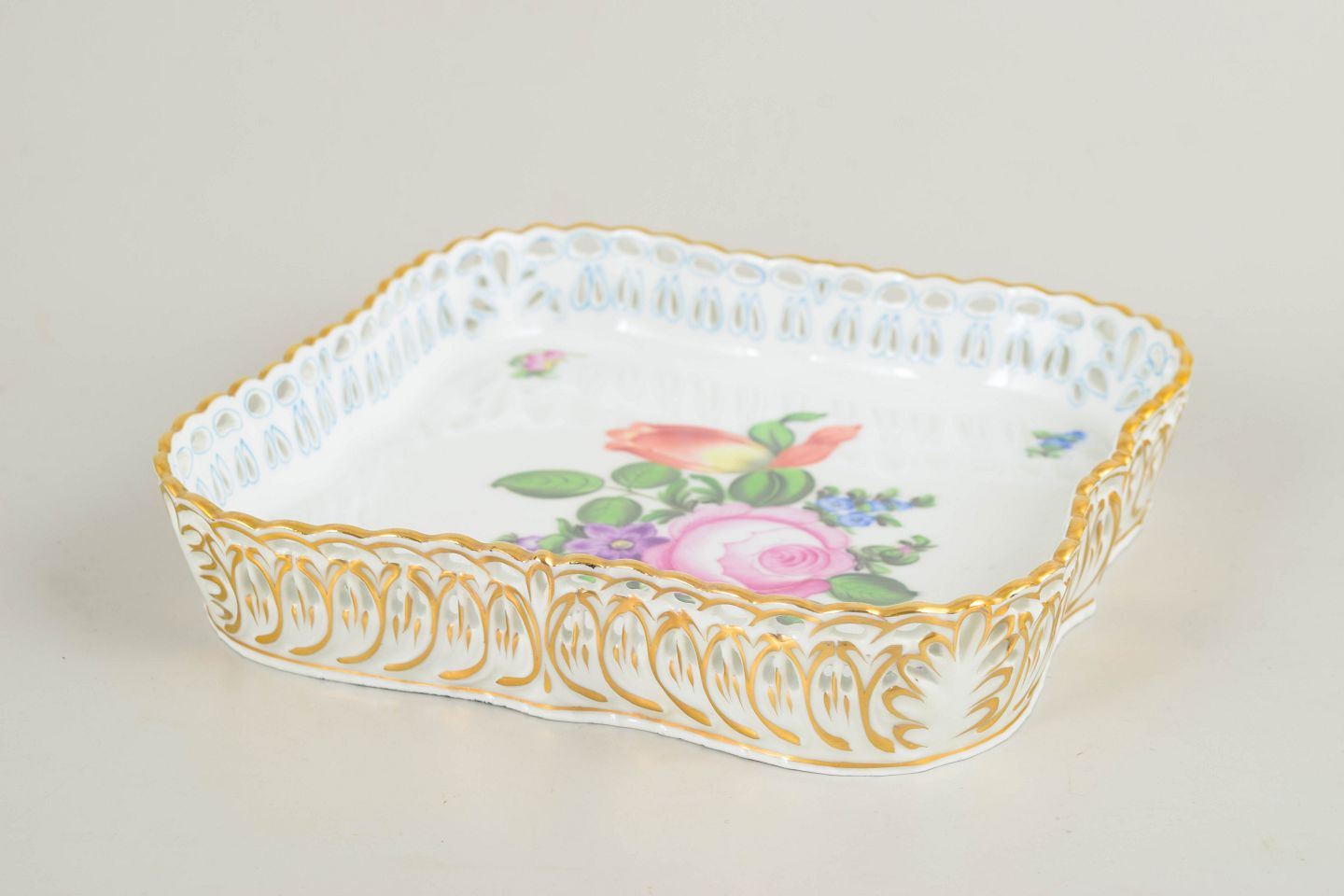 Herend, serveringsfad.Håndmalet serveringsfad i glaseret porcelæn med blomstermotiv i rosa, grønne og blå nuancer. Kvadratisk form med bølget, profileret kant og rigt forgyldt dekoration langs randen.