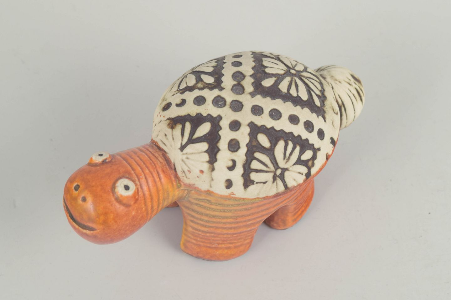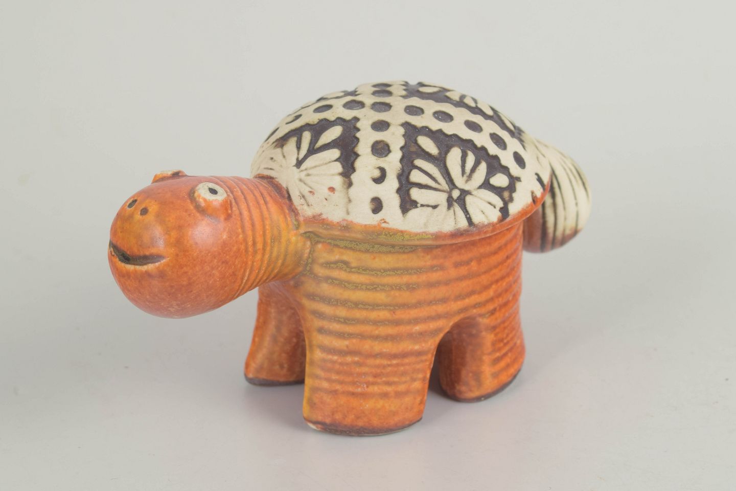 Lisa Larson for Gustavsberg, skildpaddefigur.Stiliseret skildpadde i stentøj med kompakt, næsten arkitektonisk kropsform og korte, kraftige ben. Udført med varm, orangebrun glasur på kroppen og kontrasterende skjold dekoreret med grafiske blomster- og prikmotiver i sort og råhvid. Et karakteristisk eksempel på Lisa Larsons figurative formsprog fra 1970’erne, hvor humor og enkelhed kombineres med stærk dekorativ virkning.