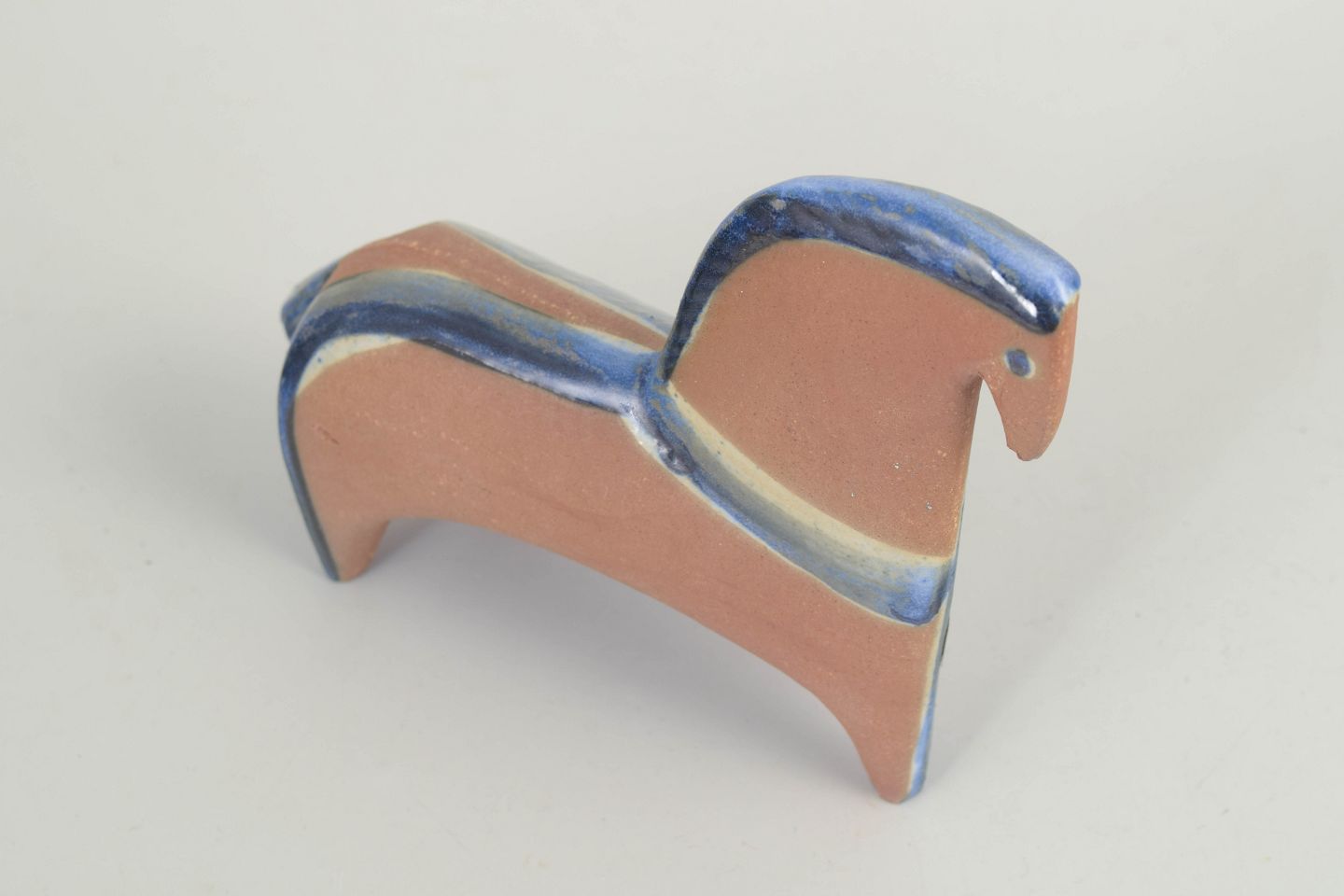 Lisa Larson for Gustavsberg, hestefigur.Stiliseret hest i stentøj med kompakt, arkitektonisk form og bløde, afrundede konturer. Udført med mat, sandfarvet glasur kombineret med dæmpede blå og lyse nuancer, karakteristisk for Lisa Larsons formsprog. Figuren er fra 1970’erne og bærer originalt Gustavsberg-mærke.