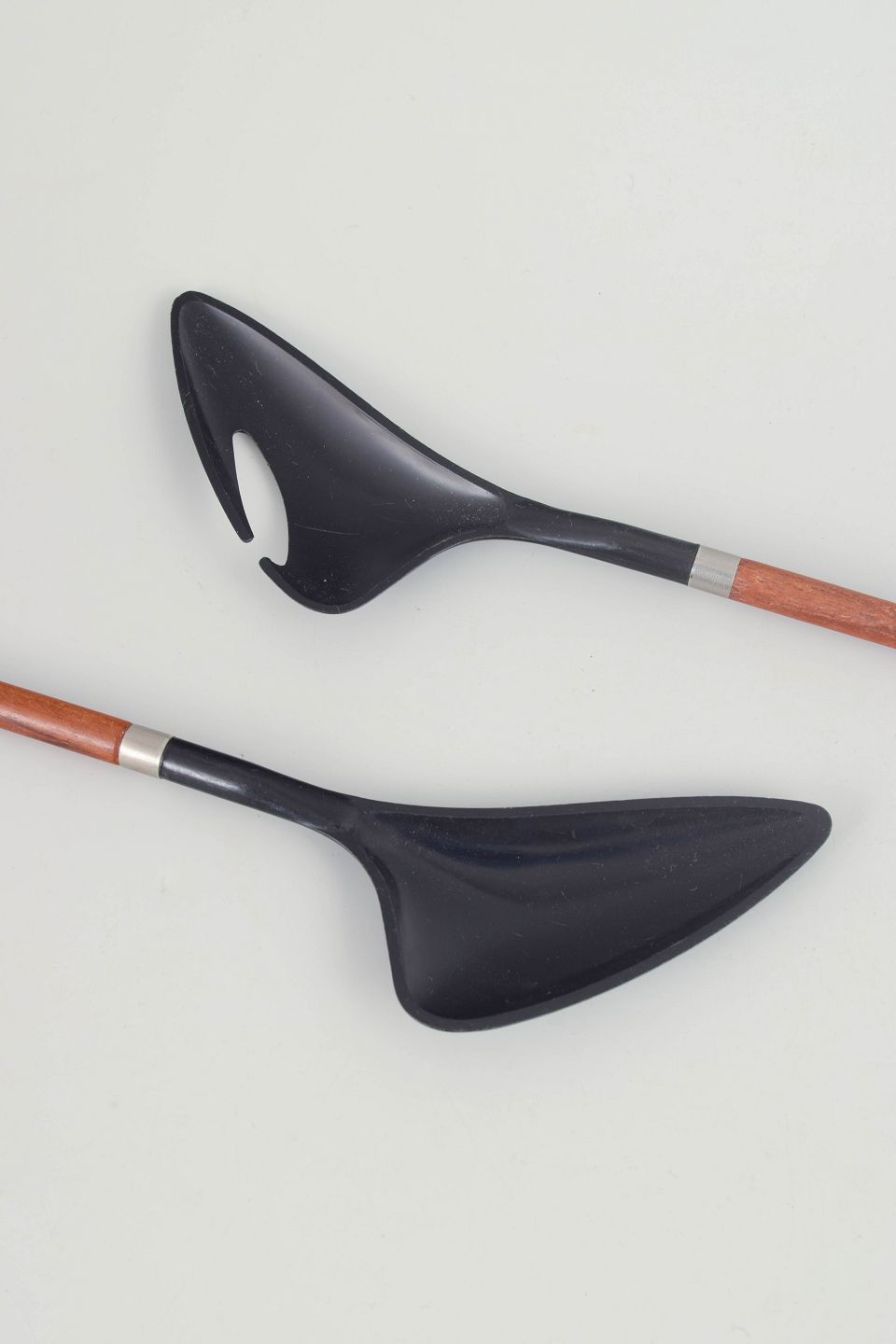 Illums Bolighus, salatsæt.Elegant salatsæt i moderne dansk design med slanke skafter i eksotisk træ og organiske, sortformede serveringshoveder. En let og skulpturel helhed, velegnet til både hverdagsbrug og borddækning. Mærket “Denmark”.