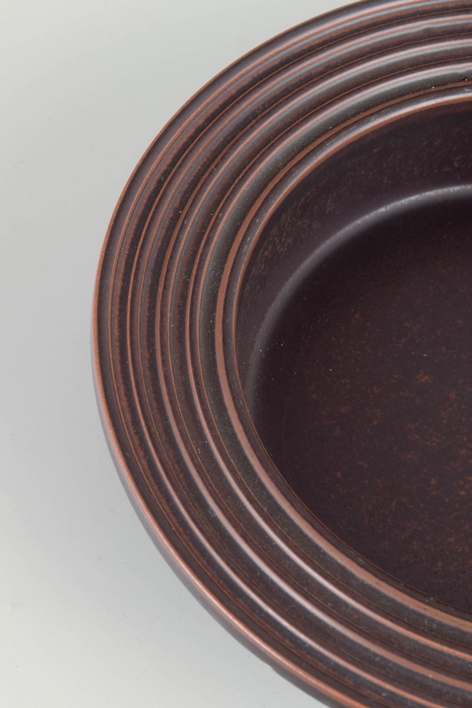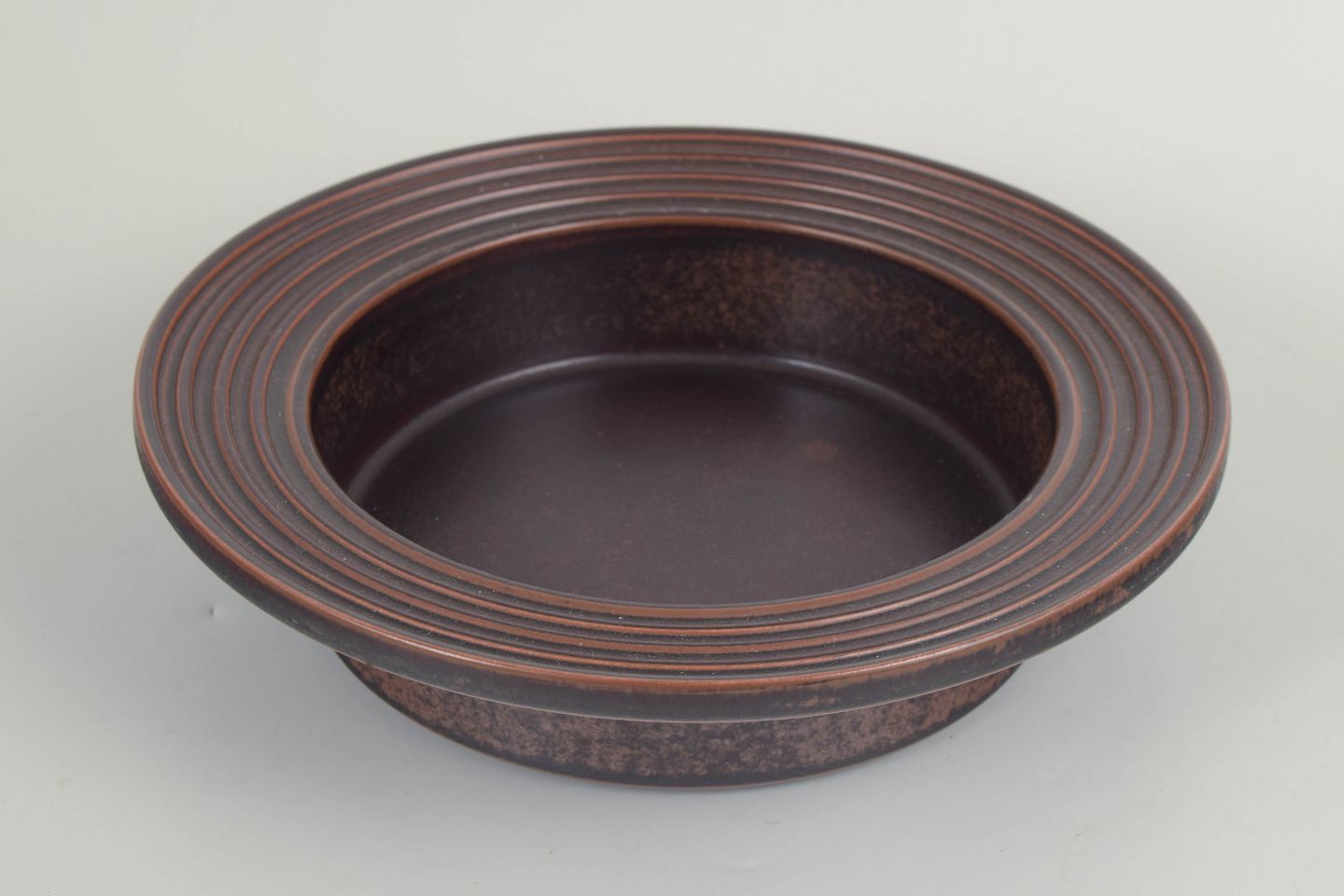 Ulla Procopé for Arabia, Ruska skål.Stor skål i stentøj fra Ruska-serien hos Arabia, udført med karakteristisk, meleret mørkebrun glasur i varme jordtoner. Åben, rund form med bred, profileret fane og dyb kumme, velegnet til servering. Glasuren varierer naturligt og giver skålen et individuelt udtryk.