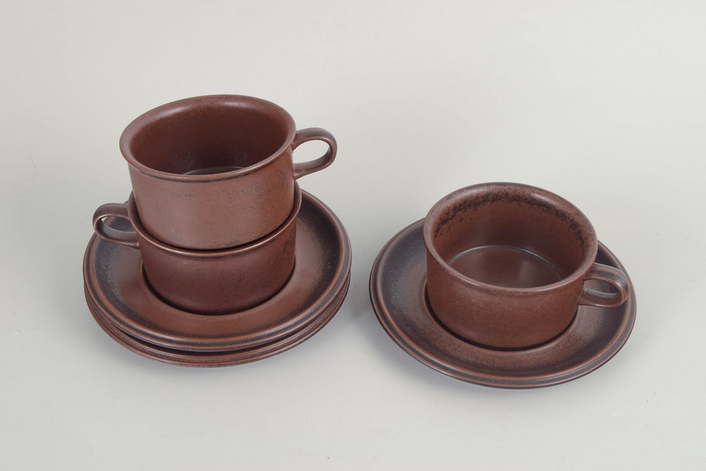 Ulla Procopé for Arabia, Ruska tekopper med tilhørende underkopper, sæt af 3.Sæt bestående af tre tekopper i stentøj med matchende underkopper fra Ruska-serien hos Arabia. Udført med den karakteristiske, melerede brune glasur i varme jordtoner. Cylindrisk kopform med hank og brede underkopper med let forhøjet fane. Glasuren varierer naturligt og giver hvert sæt et individuelt udtryk.