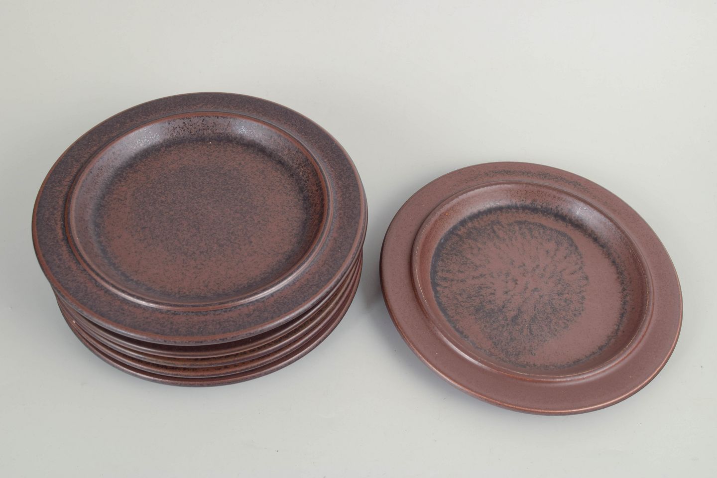 Ulla Procopé for Arabia, Ruska tallerkener, sæt af 6.Sæt bestående af seks tallerkener i stentøj fra Ruska-serien hos Arabia, udført med den karakteristiske, melerede brune glasur i varme jordtoner. Klassisk cirkulær form med let forhøjet fane og levende glasuroverflade, hvor naturlige variationer giver hvert stykke et individuelt udtryk.