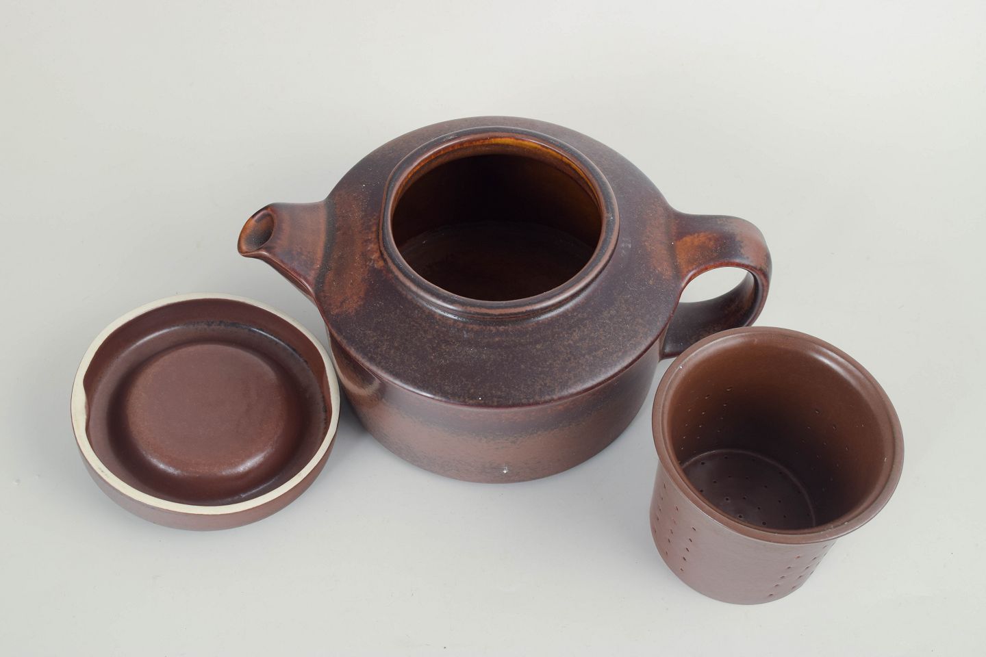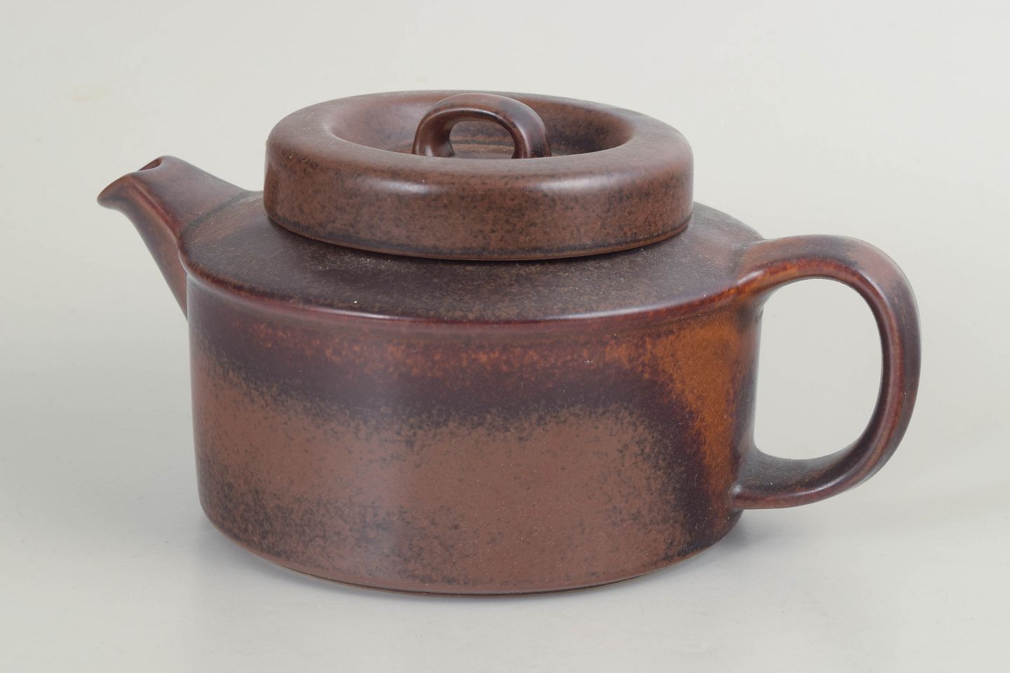 Ulla Procopé for Arabia, tekande med låg.Kompakt tekande i stentøj fra Arabia, udført i serien Ruska med karakteristisk, meleret brun glasur i varme jordtoner. Lav, cylindrisk form med integreret tud, bred hank og fladt låg med ringgreb.