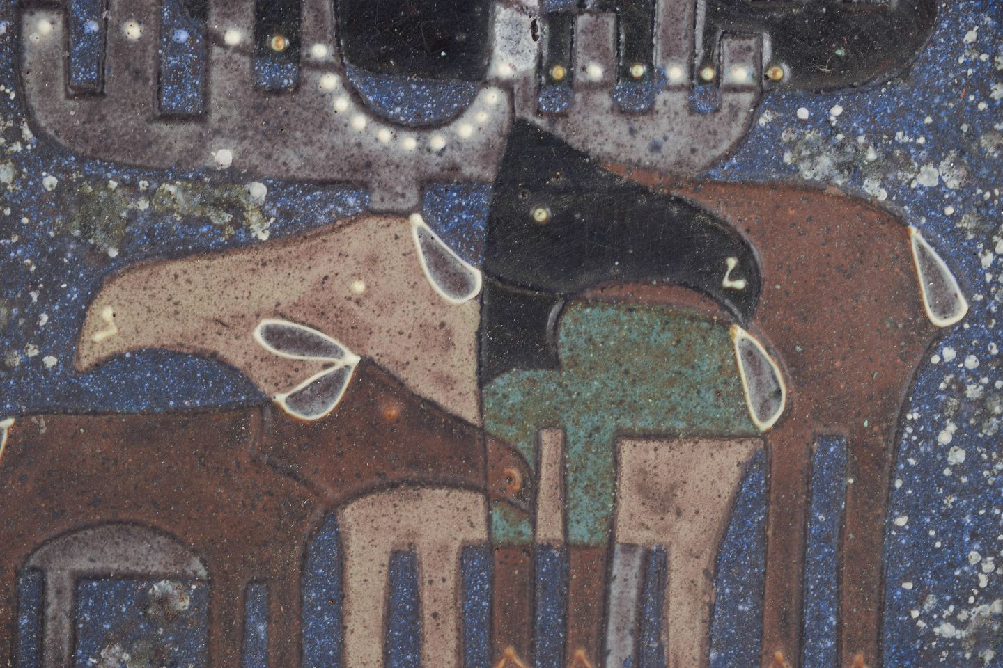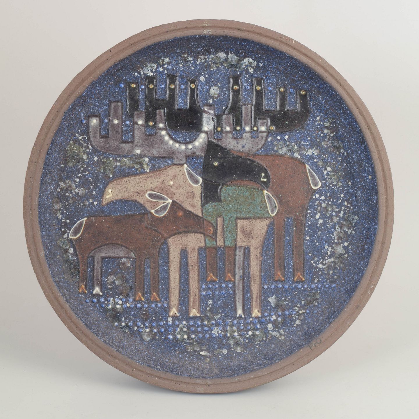 Tomas Hellström for Nittsjö, stort fad.Sjældent, meget stort rundt fad i glaseret stentøj med karakteristisk dekor i blå og jordfarvede nuancer, udført med stiliserede elge i et grafisk, 1970’er-præget formsprog. Overfladen har et levende, spættet glasurudtryk, der fremhæver motivets kontrast og dybde.