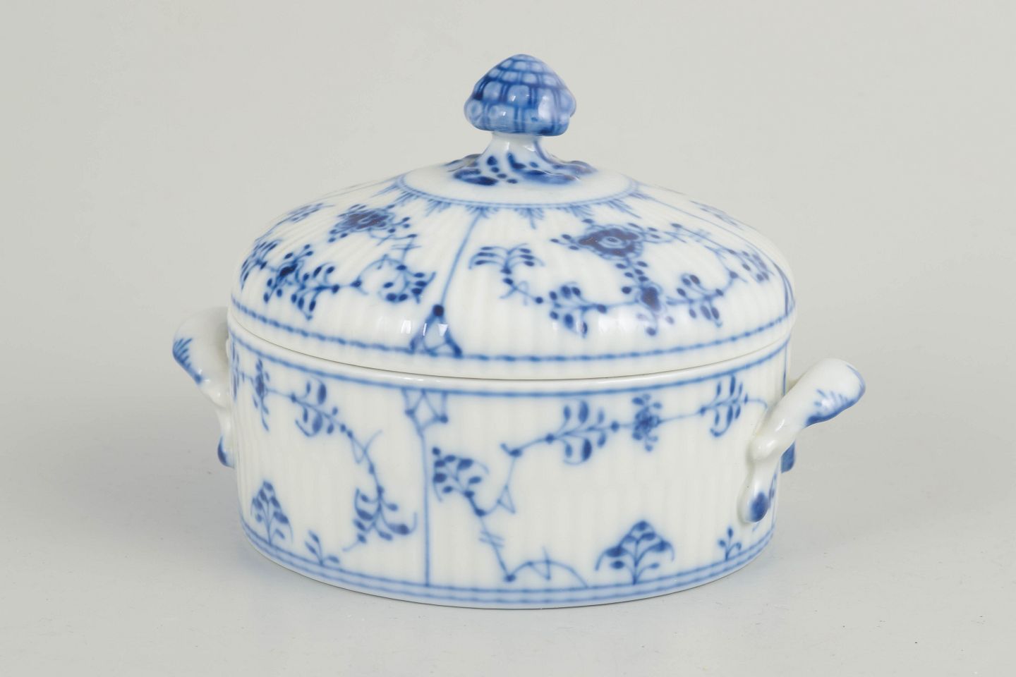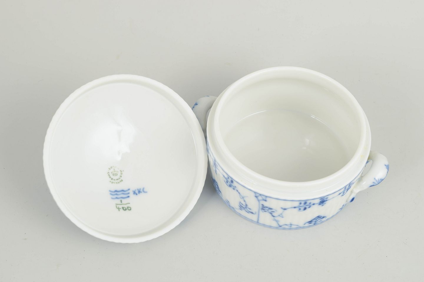 Royal Copenhagen, sukkerskål med låg og hanke, Musselmalet riflet. 1980´erne.Rillet sukkerskål i glaseret porcelæn med håndmalet underglasurdekoration i koboltblå. Rund, lav form med to integrerede hanke samt låg afsluttet med knop. Model 1/400.
