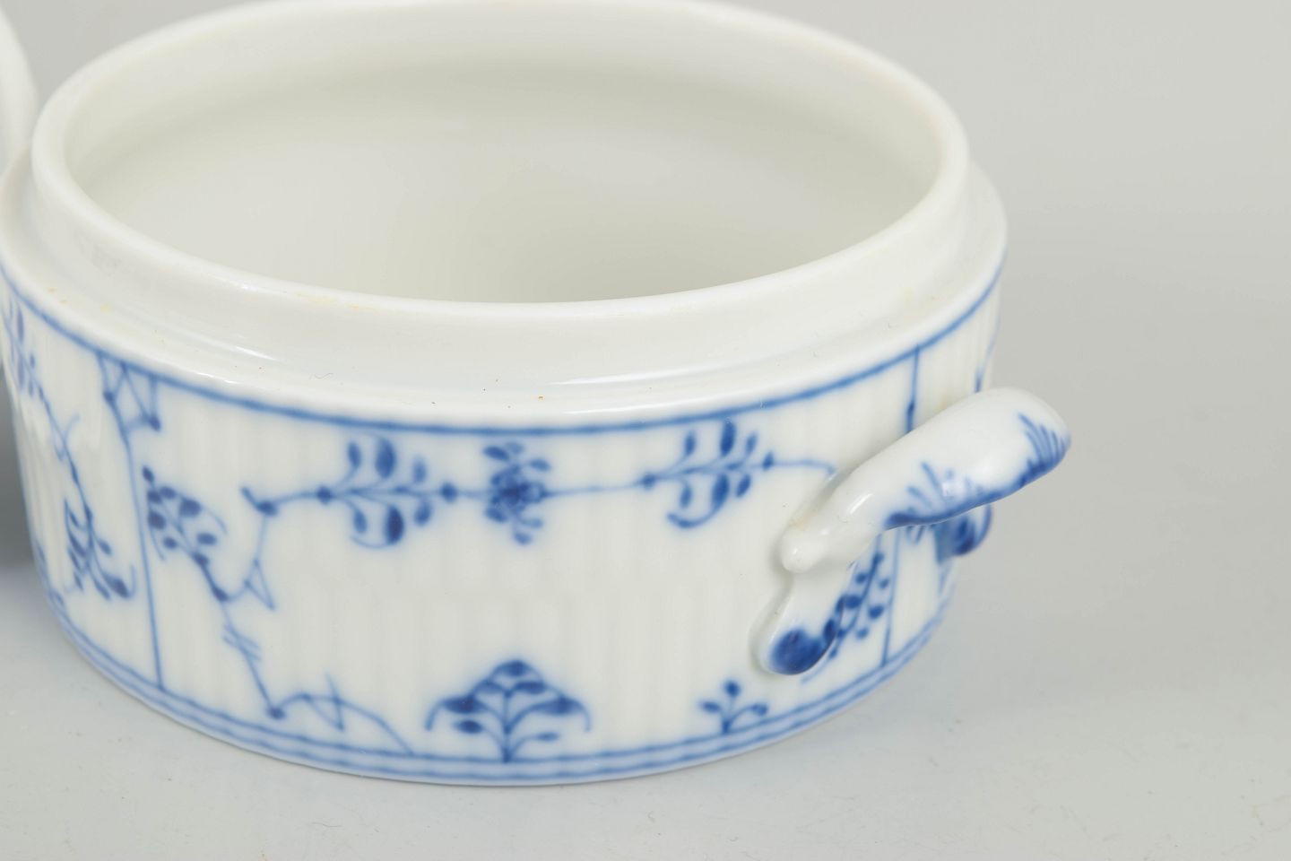 Musselmalet riflet er Royal Copenhagens mest traditionsrige stel og kendetegnes af den riflede form kombineret med håndmalet blå underglasurdekoration. Hvert stykke males i hånden efter klassiske forlæg, hvilket giver små variationer og understreger stellets høje håndværksmæssige kvalitet og tidløse udtryk.