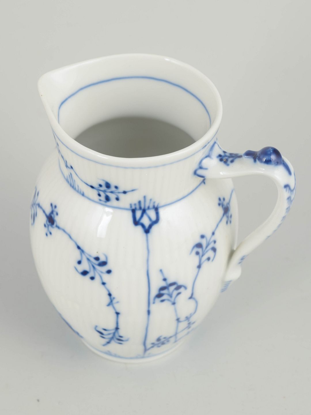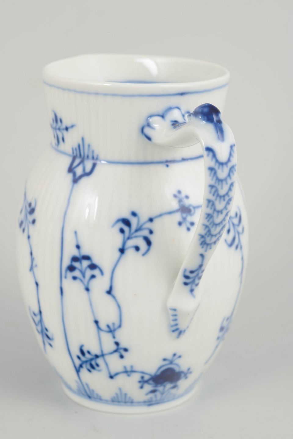 Royal Copenhagen, flødekande, Musselmalet riflet.Rillet flødekande i glaseret porcelæn med håndmalet underglasurdekoration i koboltblå. Klassisk balusterform med svunget hældetud og dekorativ hank. Model 1/459. 1980´erne.