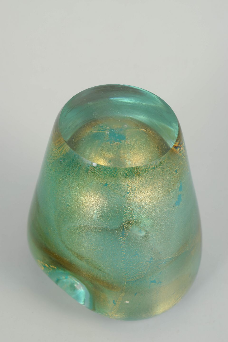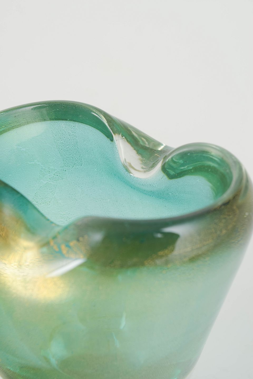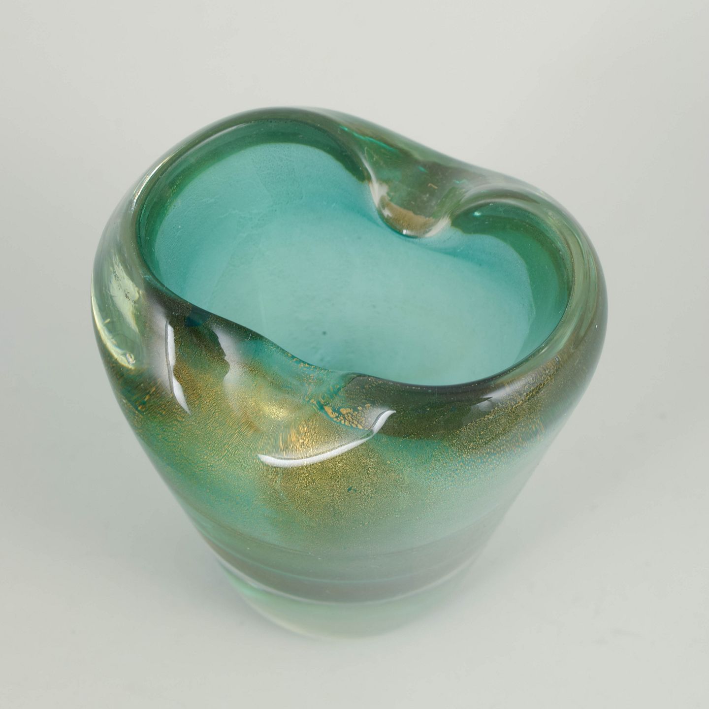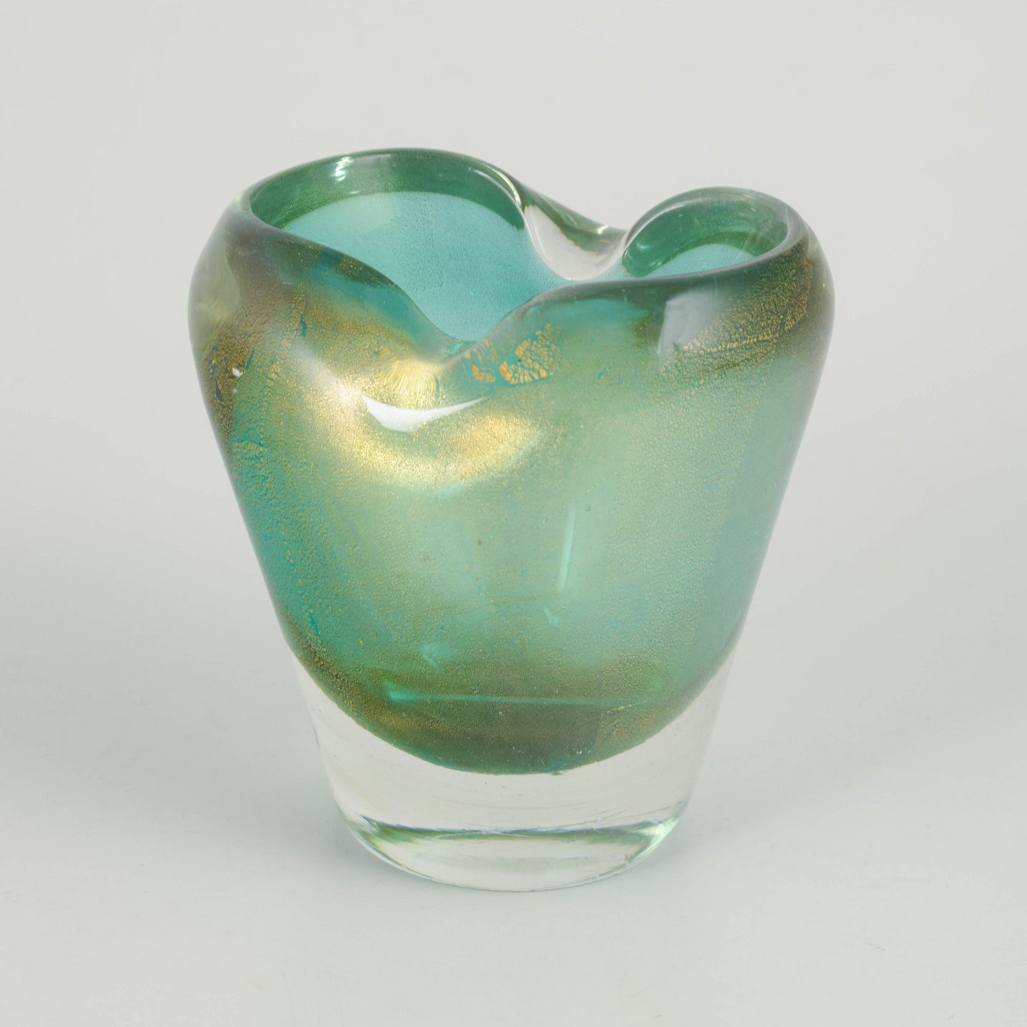 Murano vase.Skulpturel vase i mundblæst kunstglas med fri, organisk åbning og let asymmetrisk kant. Glasset fremstår i klare turkisgrønne nuancer med gyldne indeslutninger, der giver dybde og et blødt, levende farvespil. Den massive, klare fod danner en stabil base og kontrasterer elegant mod den farvede overdel. Formen og materialebehandlingen er karakteristisk for muranesisk kunstglas fra midten af det 20. århundrede.
