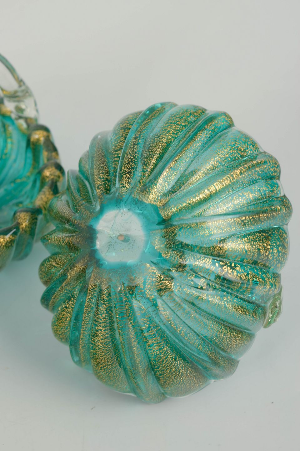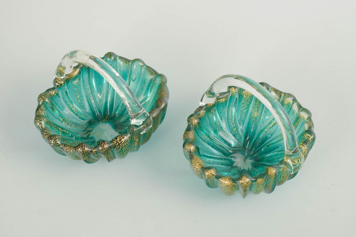 Murano, par kurve.Par dekorative kurve i mundblæst kunstglas med organisk, bølget korpus og klare, opadbøjede hanke. Glasset er udført i turkisgrønne nuancer med gyldne indeslutninger, som giver overfladen dybde og et levende farvespil. Formen og dekorationen er karakteristisk for muranesisk kunstglas fra midten af det 20. århundrede, hvor funktionelle objekter ofte blev udformet som små skulpturelle værker.