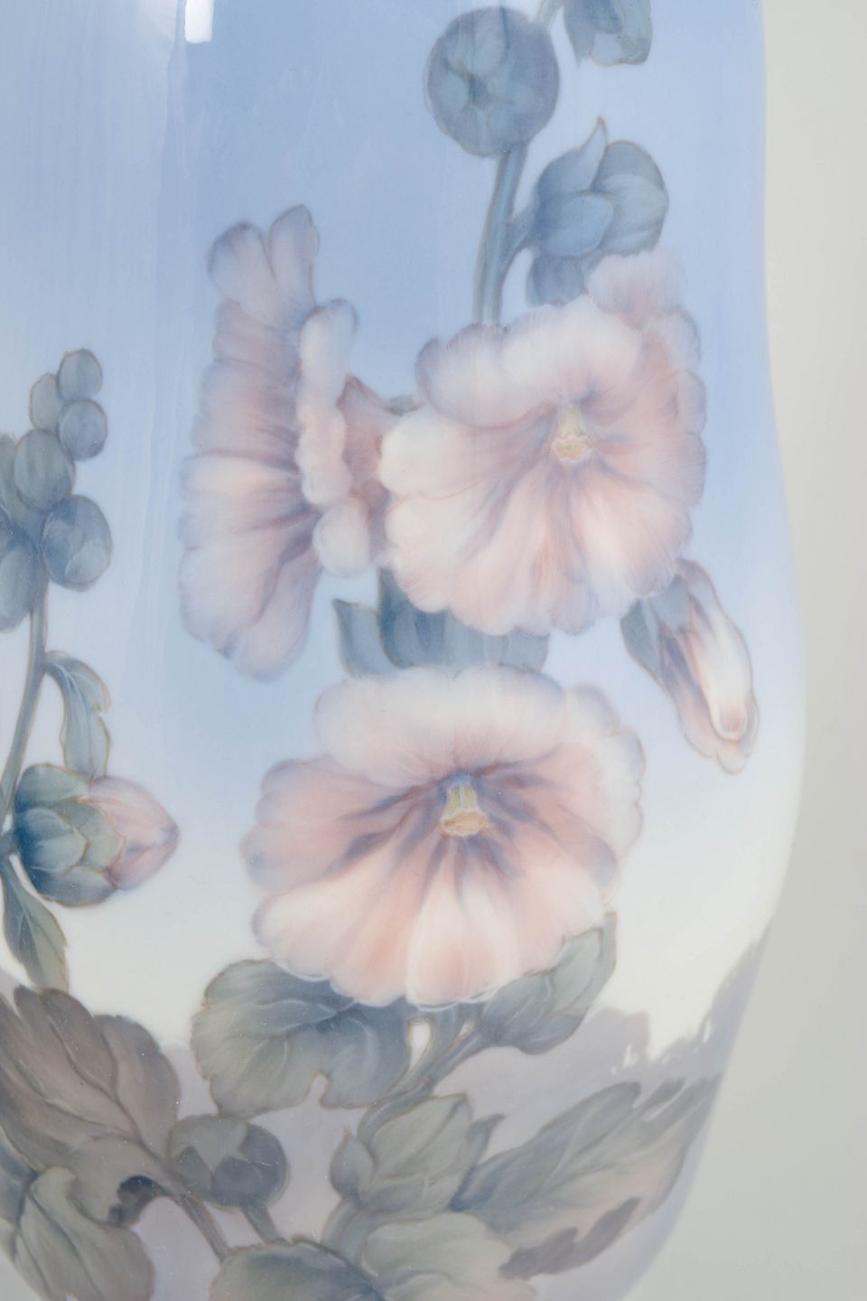 Royal Copenhagen, vase.Stor, elegant balusterformet vase i glaseret porcelæn med håndmalet underglasurdekoration af blomster og løv i bløde rosa, grønne og grå toner mod en sart blå tonet bund. Dekorationen er rigt nuanceret og harmonisk afstemt med vasens generøse proportioner.