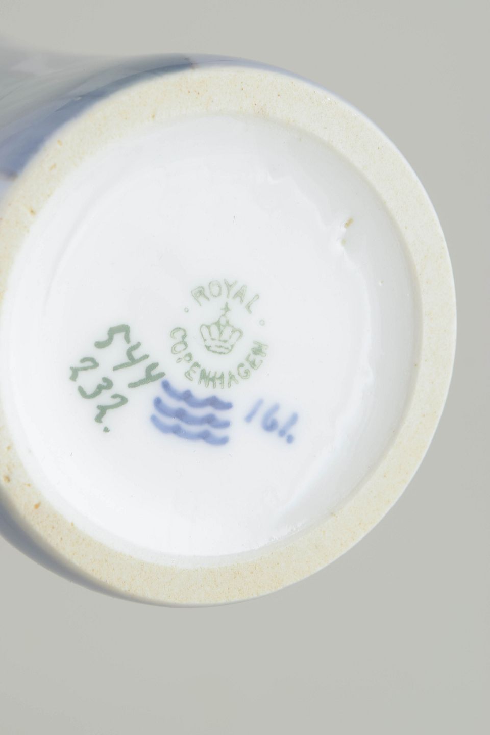 Royal Copenhagen, vase.Høj, let facetteret vase i glaseret porcelæn med håndmalet underglasurdekoration af irisblomster i dybe blå nuancer med grønne stilke, udført mod en lys, let tonet bund. Dekorationen er elegant strakt langs vasens lodrette form og afspejler Royal Copenhagens naturalistiske formsprog i 1920’erne.
