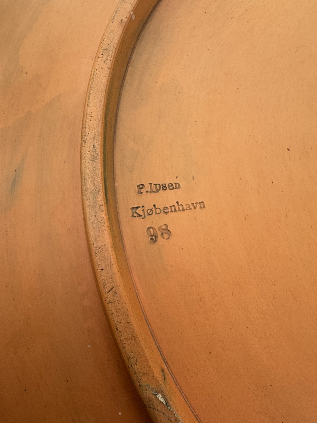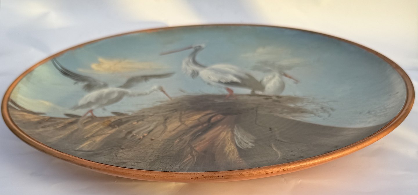 Meget stor platte terracotta fra Peter Ipsen, Kjøbenhavn fra omkring 1900. Bemalet med tre storke ved storkerede. Lidt overflade brugsspor. Ingen skader eller reparationer. Fabriksmærket på bagsiden. Mål: H. 4 cm Ø. 37 cm