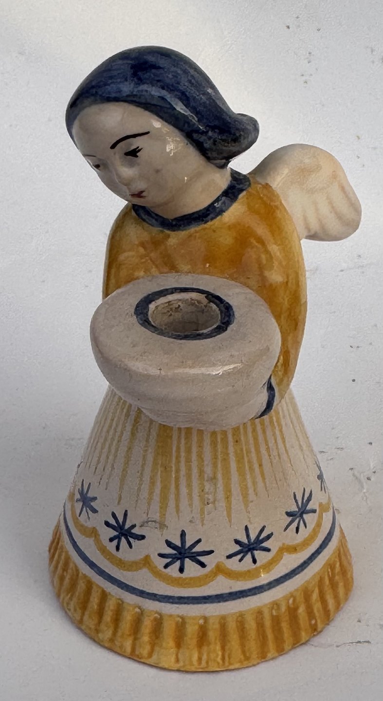 ENGEL I GUL KJOLE: Figur af bemalet engel i keramik som lyseholder fra den bornholmske lervarefabrik Lauritz Hjorth. Fremstår i god stand uden skader eller reparationer. Fabriksmærket på bunden. H. 9,5 cm