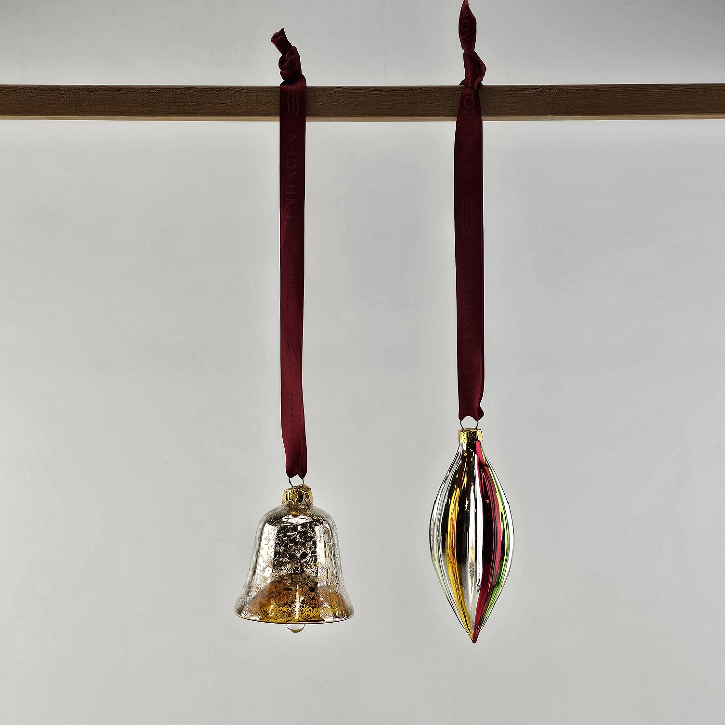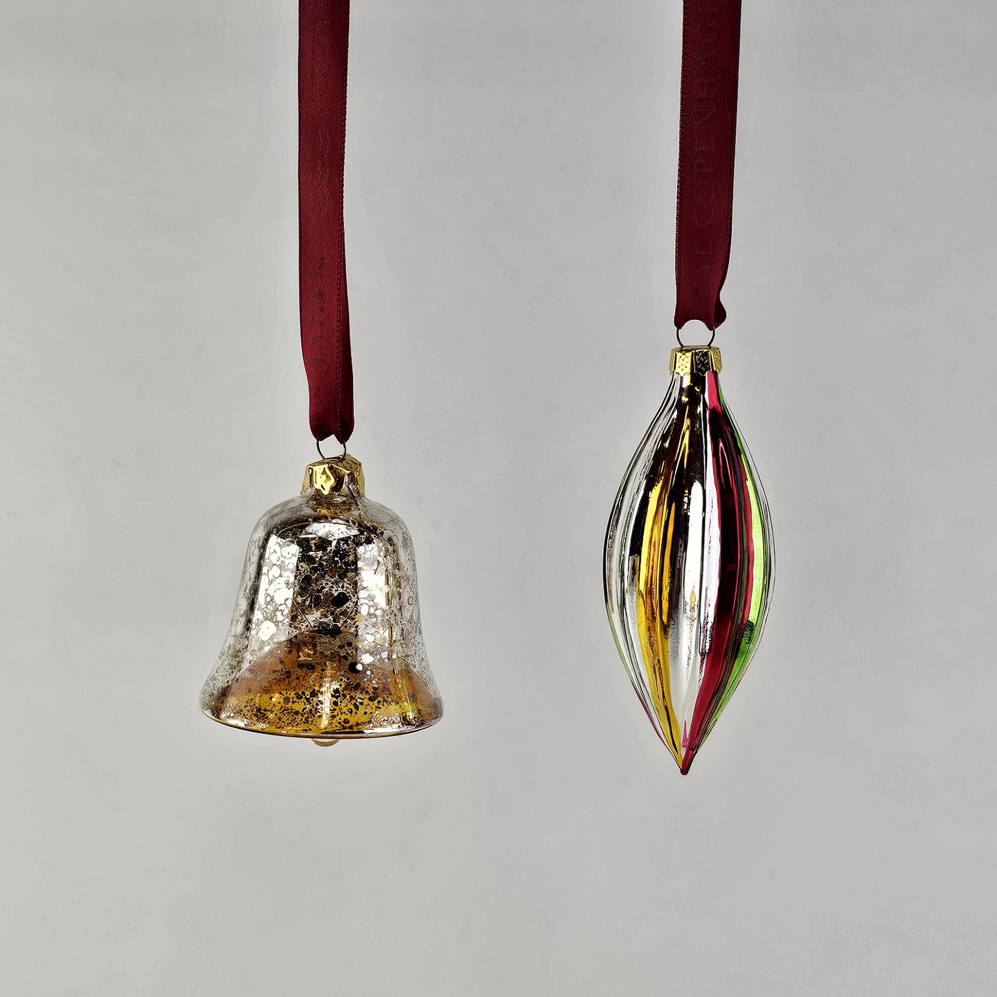 Juleornamenter i glas med motiv af en klokke og en aflang julekugle med rødt bånd til ophængI original kasse