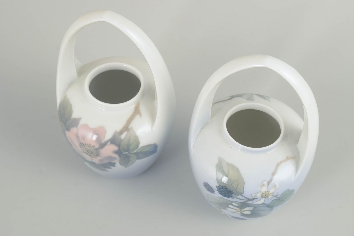Royal Copenhagen, Art Nouveau vaser med hank, sæt af 2.Sæt bestående af to vaser i glaseret porcelæn med integrerede hanke og håndmalet underglasurdekoration i Art Nouveau-stil. Dekorationerne viser blomster- og bærmotiver i afdæmpede blå, grønne og rosa nuancer. Modeller 173/29 og 288/29.