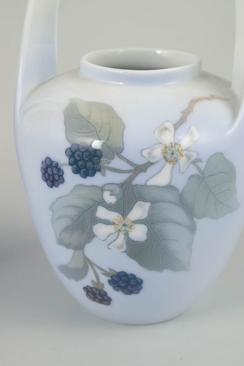 I perioden omkring 1910 arbejdede Royal Copenhagen videre med Art Nouveau-traditionen, hvor organiske former, sammenhængende linjer og naturinspirerede dekorationer var centrale elementer. Vaser med integrerede hanke er karakteristiske for perioden og afspejler ønsket om at forene funktion og dekoration i et harmonisk formsprog, udført med høj håndværksmæssig præcision.