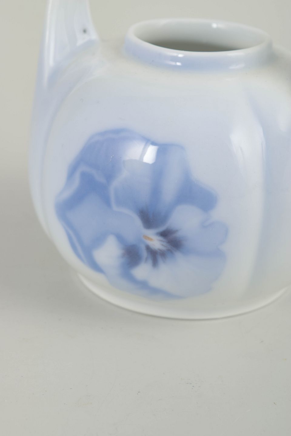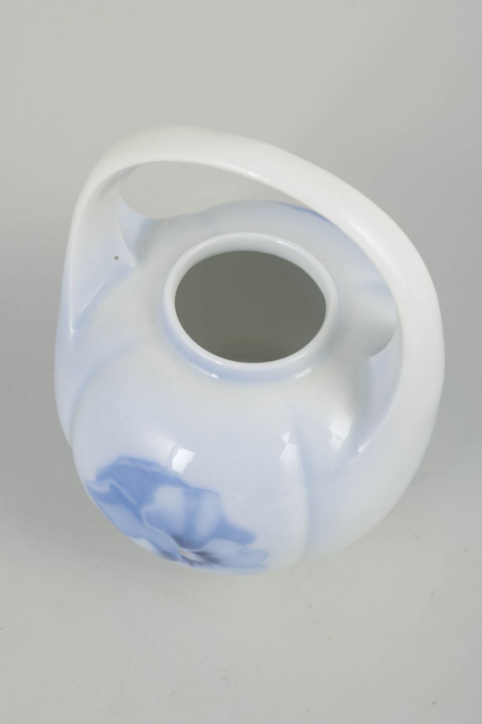 Royal Copenhagen, Art Nouveau vase med hank.Vase i glaseret porcelæn med integreret hank og håndmalet underglasurdekoration i Art Nouveau-stil med stiliseret blomsterform i bløde blå nuancer. Udført efter Royal Copenhagens model 238/29b.