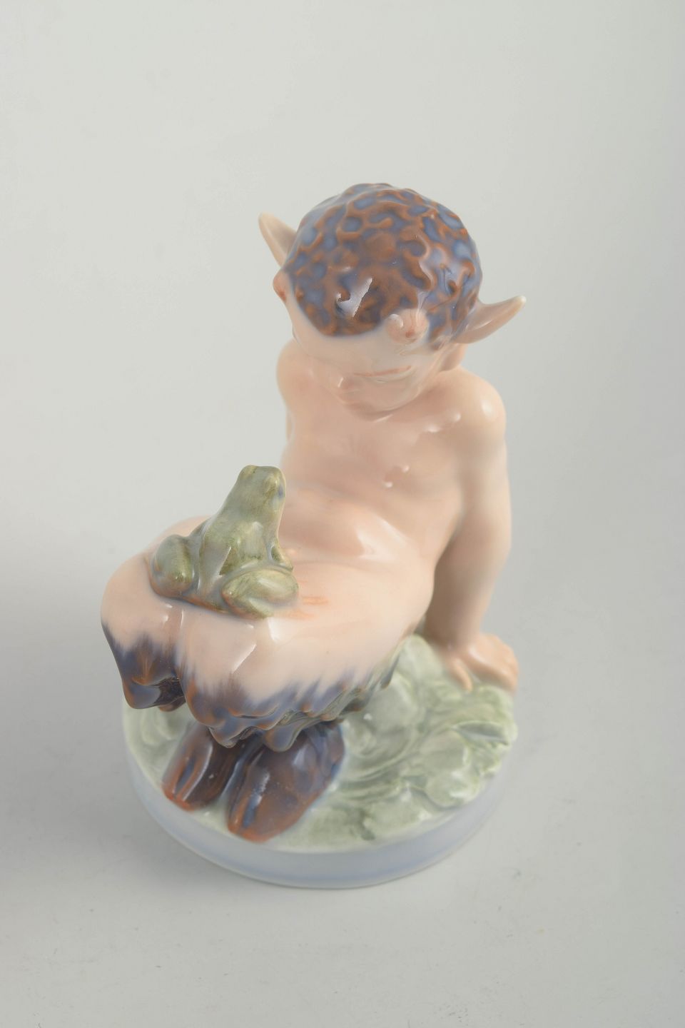 Royal Copenhagen, faun figur.Figur i glaseret porcelæn forestillende en faun og frø siddende på en base med naturalistisk modellering og bløde farveovergange i afdæmpede pasteller. Model 1713.