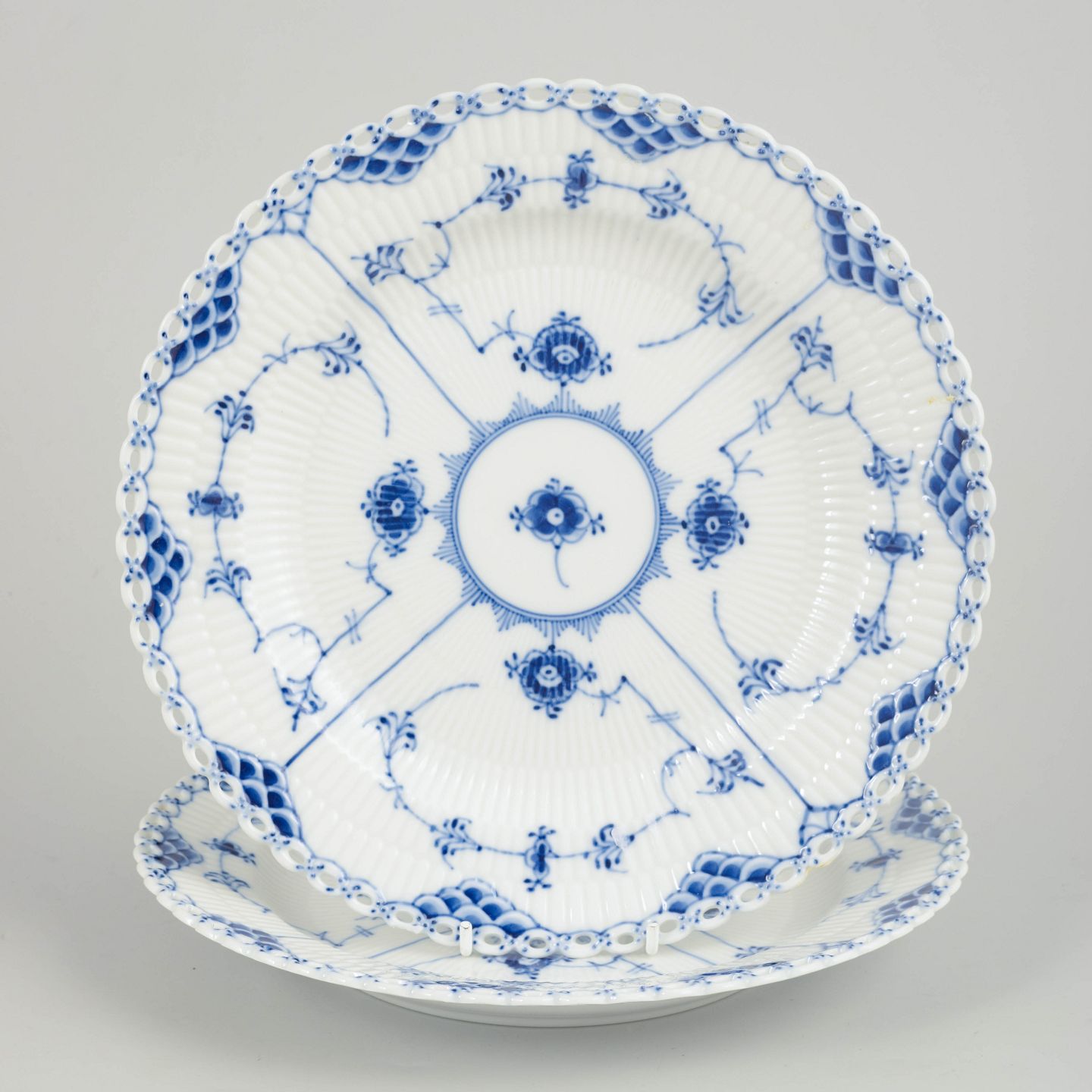 Royal Copenhagen, Musselmalet helblonde middagstallerkener, sæt af 2.Sæt bestående af to tallerkener i glaseret porcelæn med håndmalet underglasurdekoration i det klassiske musselmalede helblonde mønster, kendetegnet ved den gennembrudte blondekant.