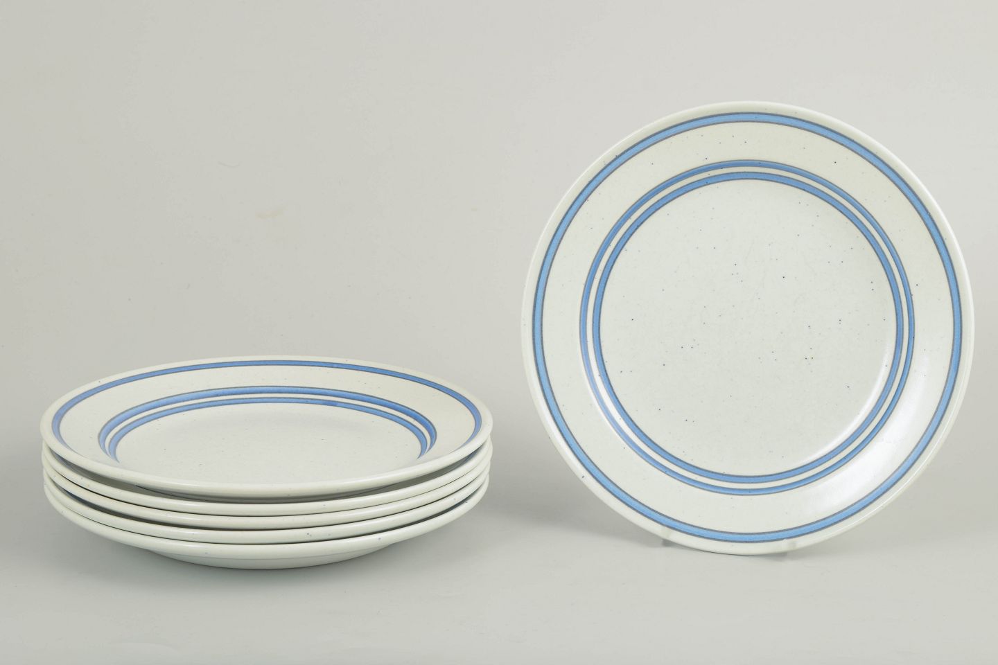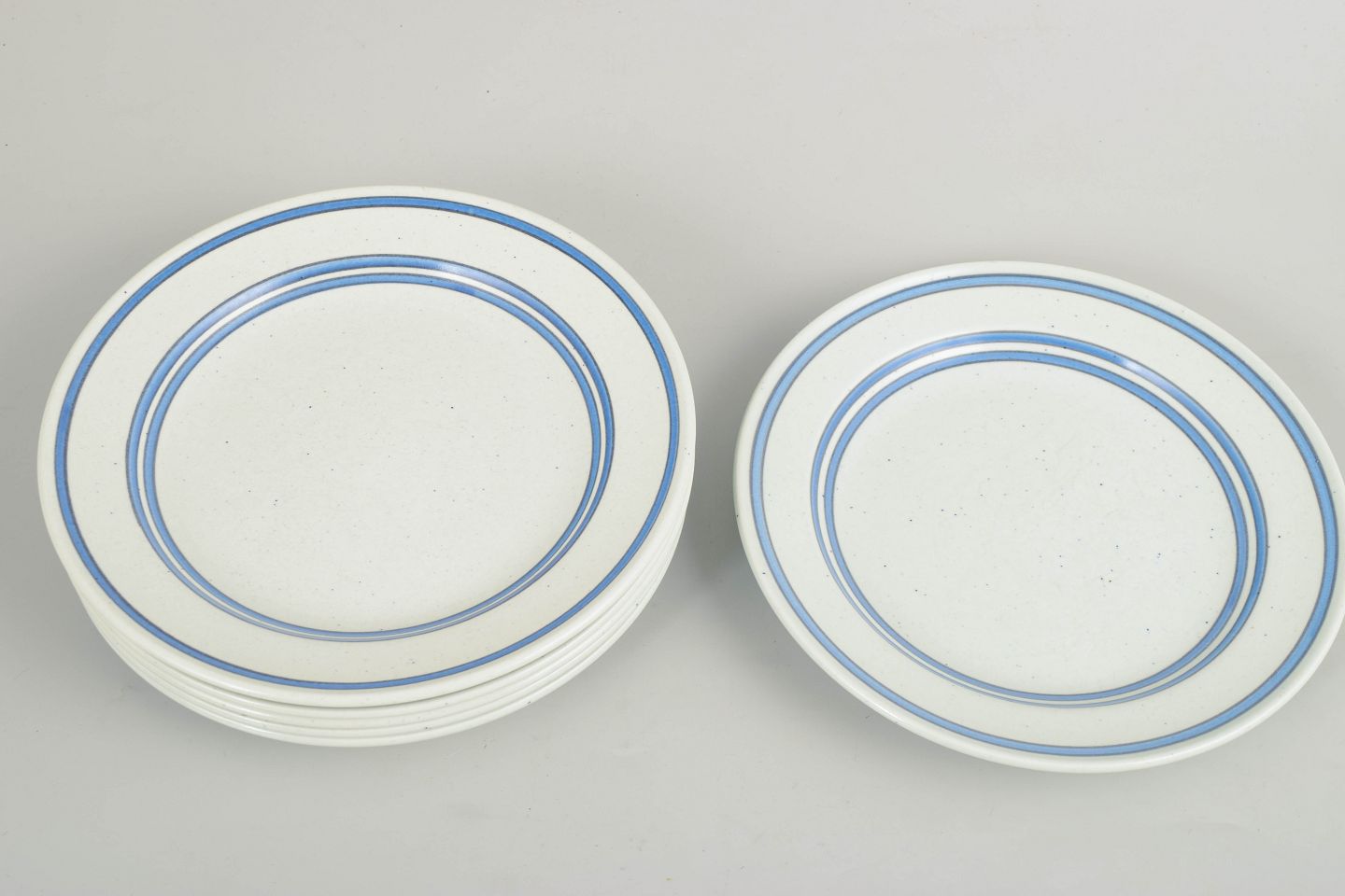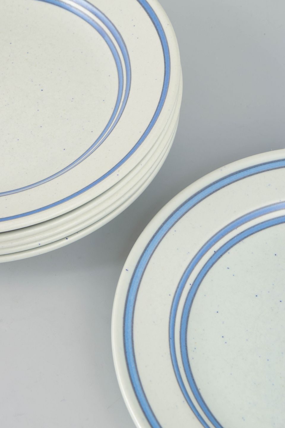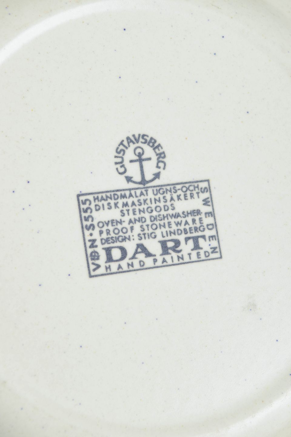 Stig Lindberg for Gustavsberg, seks tallerkener.Sæt af tallerkener i fajance med enkel, rund form og diskret dekoration i blå linjer på lys bund. Tallerkenerne er udført i Gustavsbergs “Dart”-serie, kendetegnet ved sit stringente og grafiske udtryk, som er typisk for Stig Lindbergs produktion i perioden.