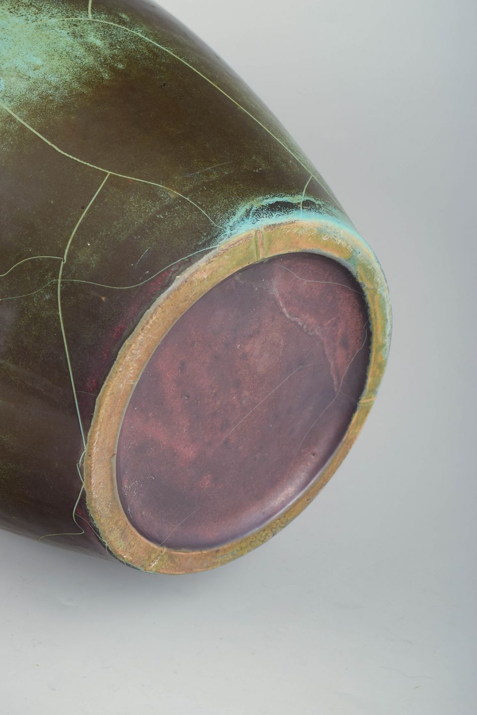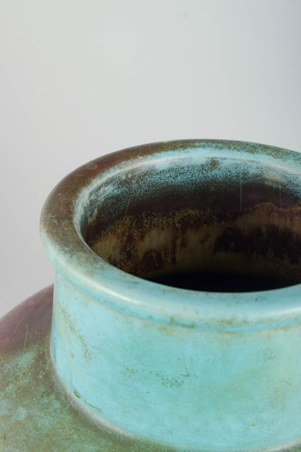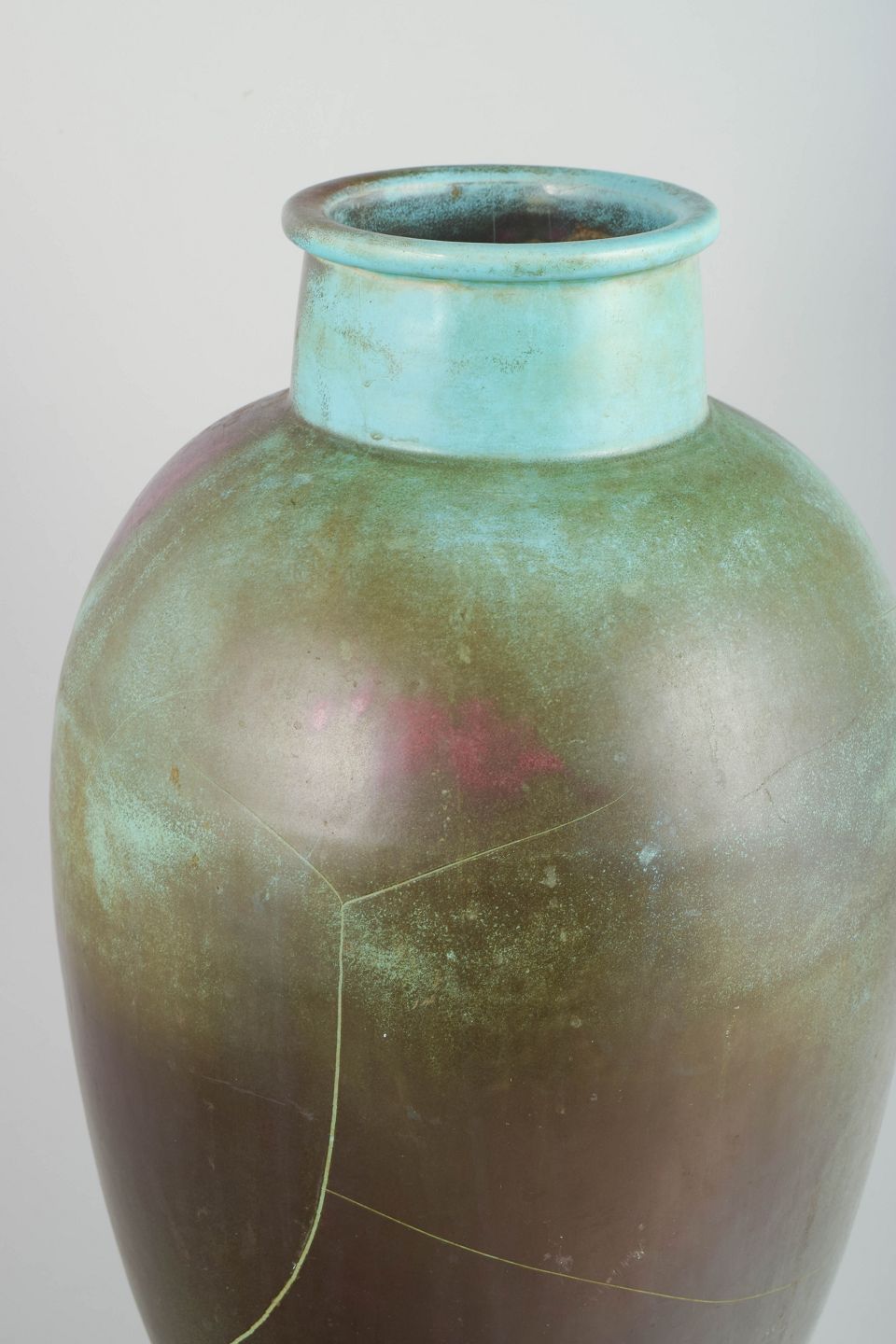 Richard Uhlmeyer, monumental gulvvase.Monumental, balusterformet gulvvase i keramik med dyb, iriserende overflade i mørke grønlige og vinrøde toner. Den høje, slanke silhuet og den markante hals giver et elegant Art Deco-præg.