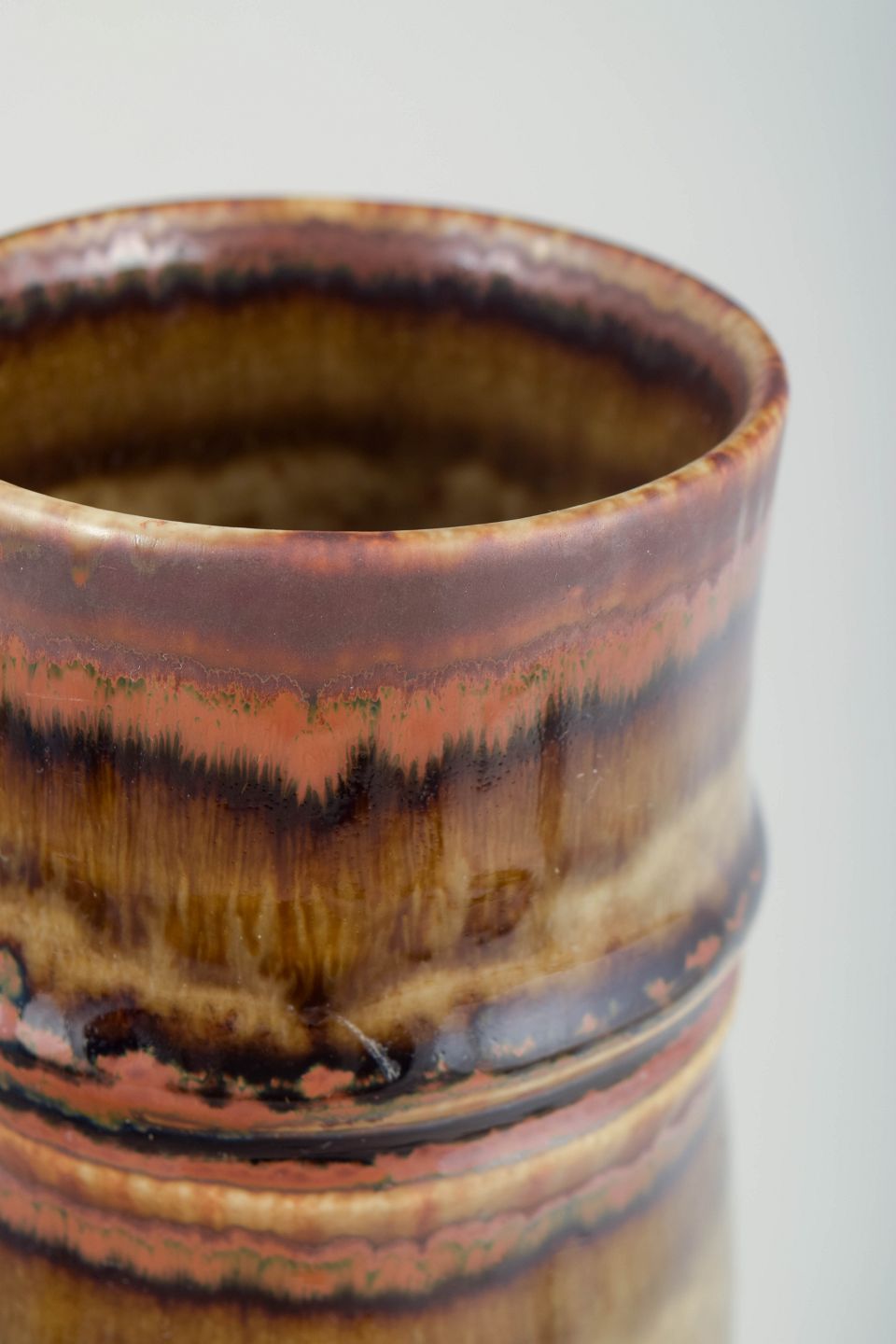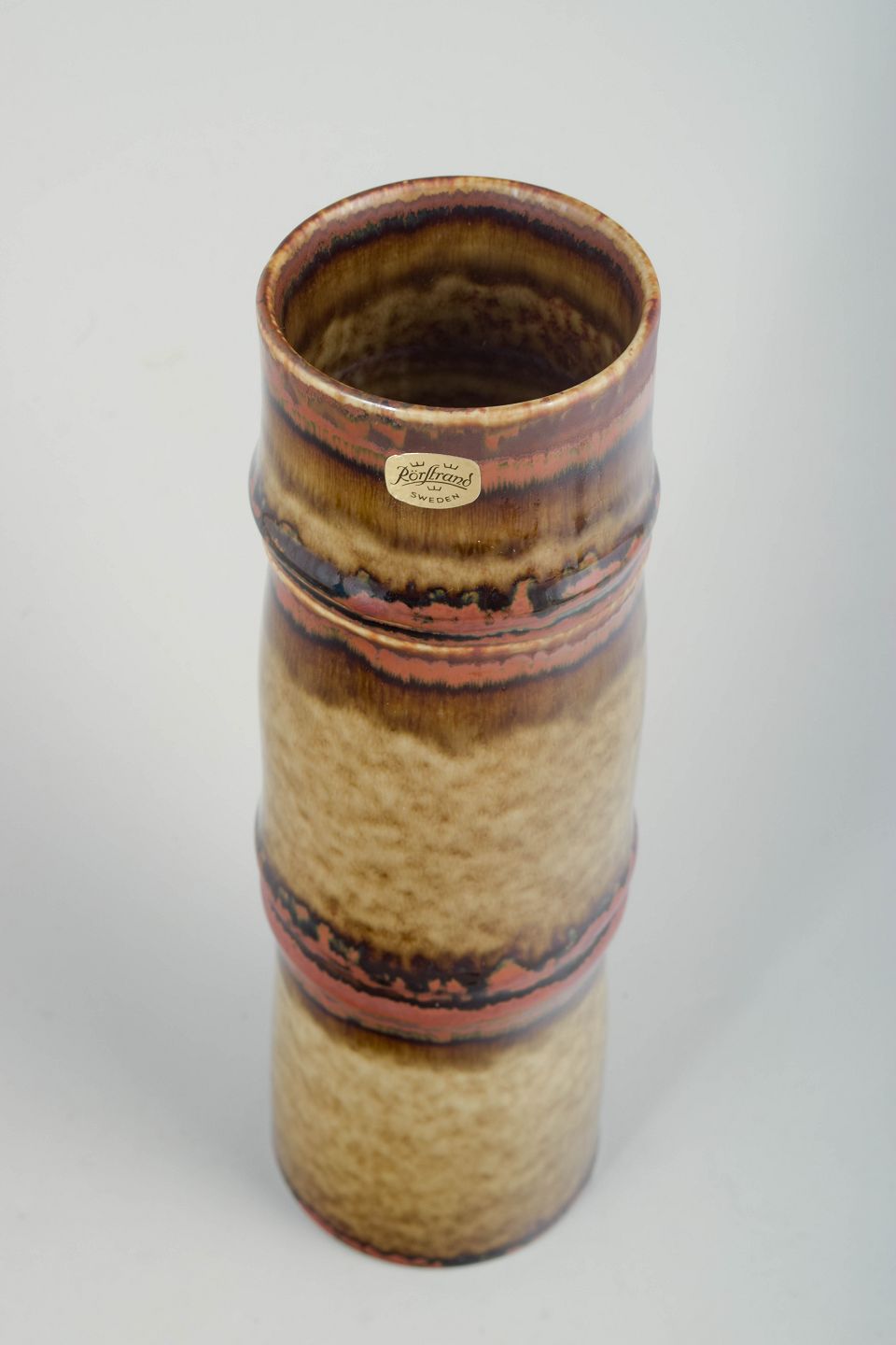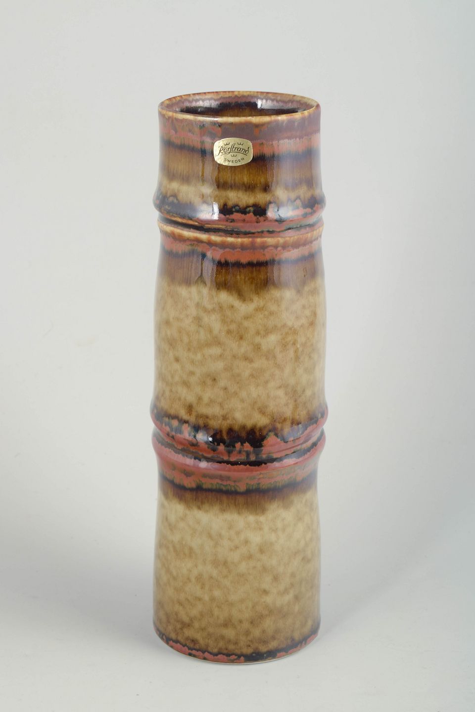 Olle Alberius for Rörstrand, vase.Slank, cylindrisk vase i stentøj med markant lodret formopbygning og let profilerede ringe. Overfladen er dækket af levende, løbende glasurer i varme brune, ravfarvede og beige nuancer med tydelig dybde og variation, karakteristisk for Rörstrands kunstneriske stentøjsproduktion i 1970’erne.