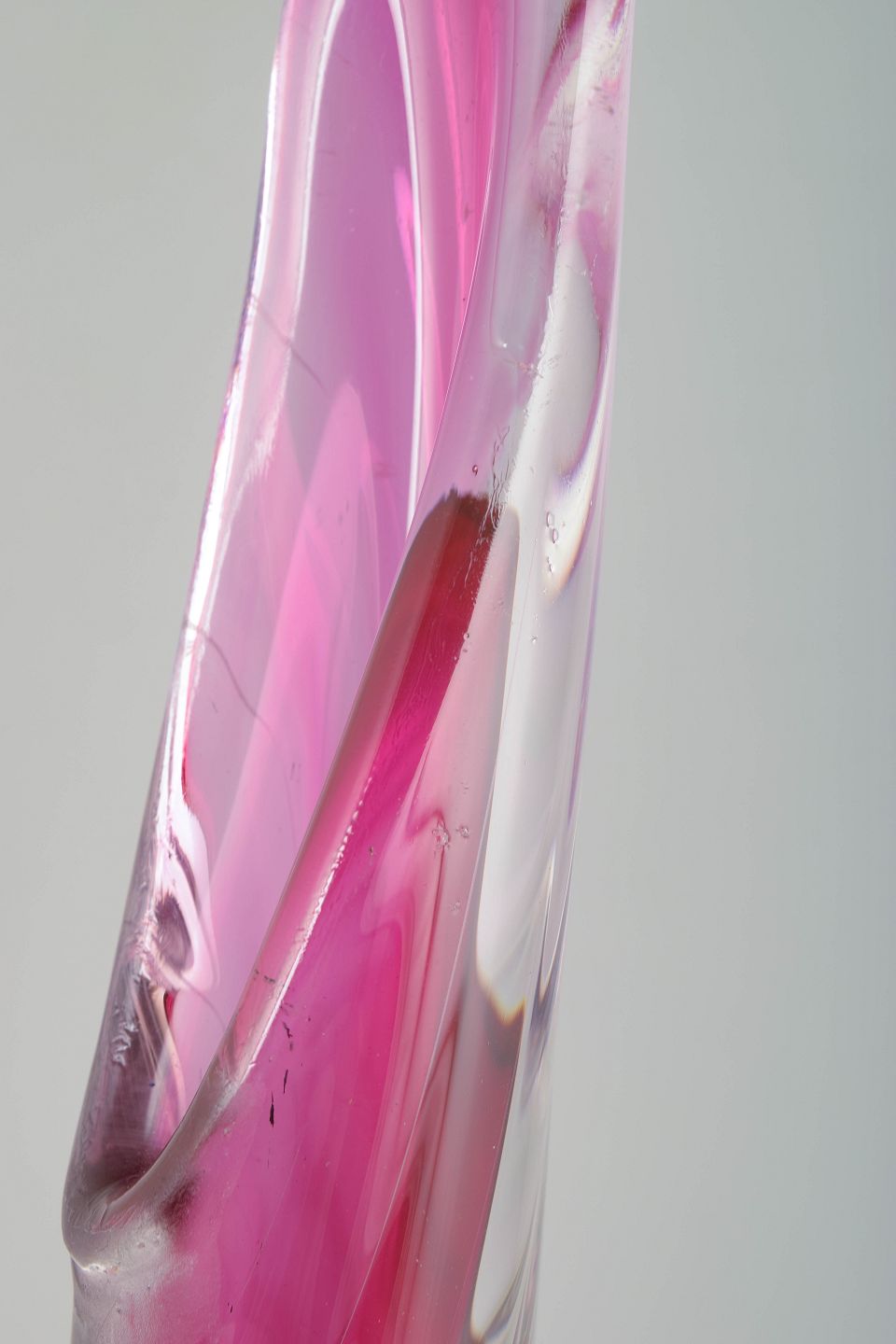 Murano, monumental vase.Høj, mundblæst glasvase med slank, opadstrakt hals og dråbeformet korpus. Udført i transparent rosa glas med elegante, snoede optiske striber og let fortykning i bunden, typisk for Murano-produktion fra midten af det 20. århundrede.