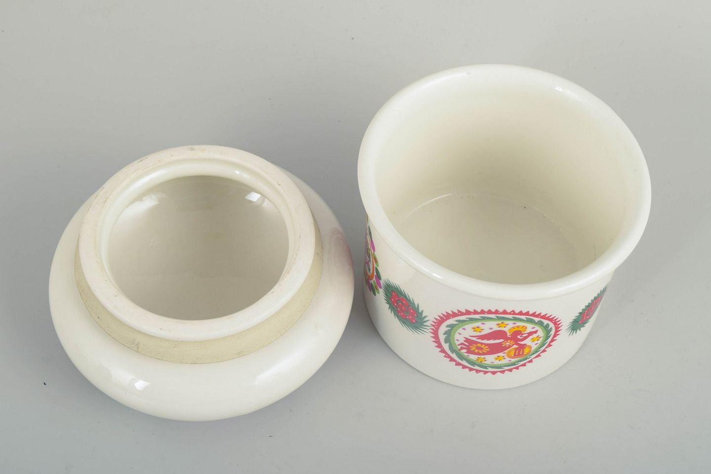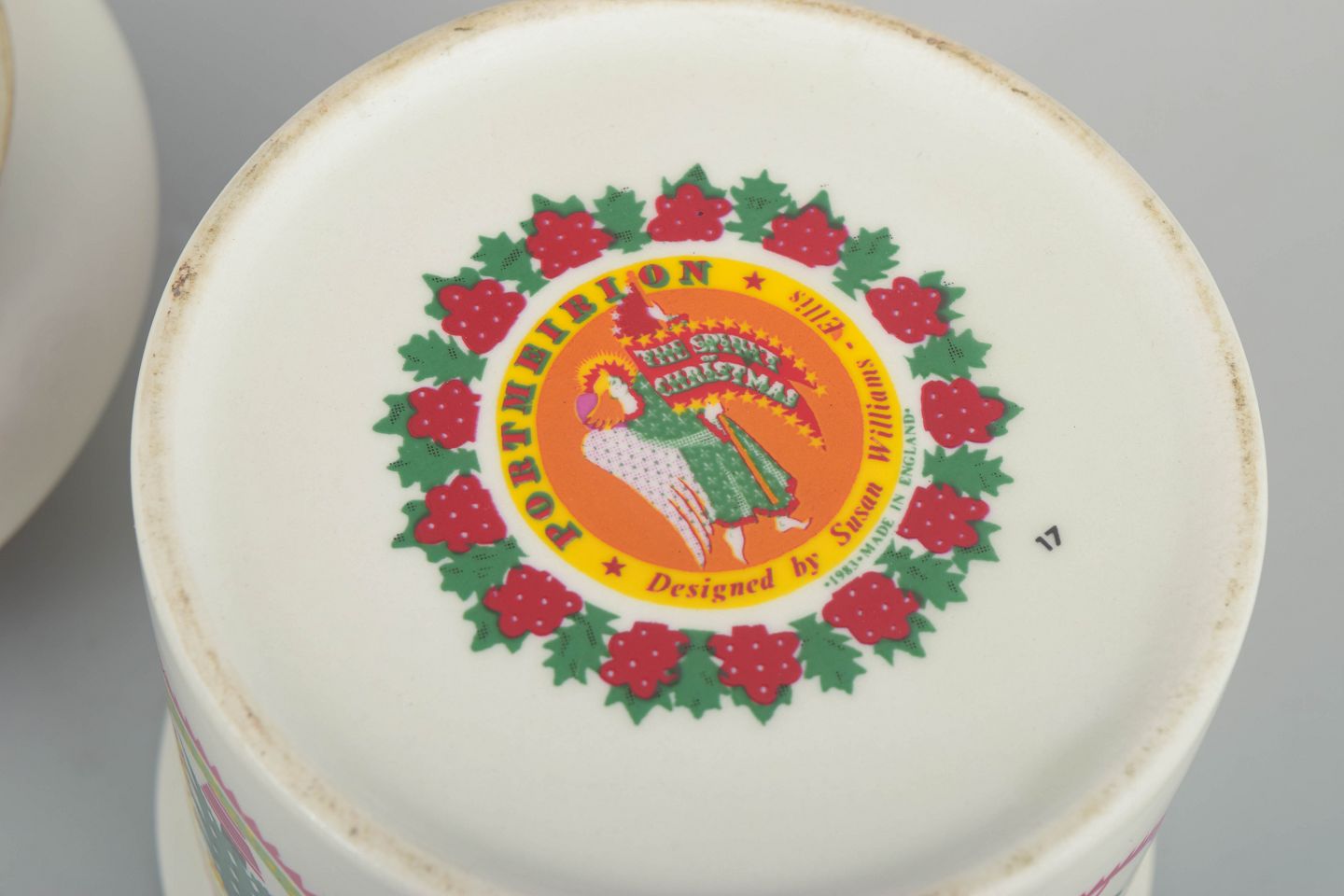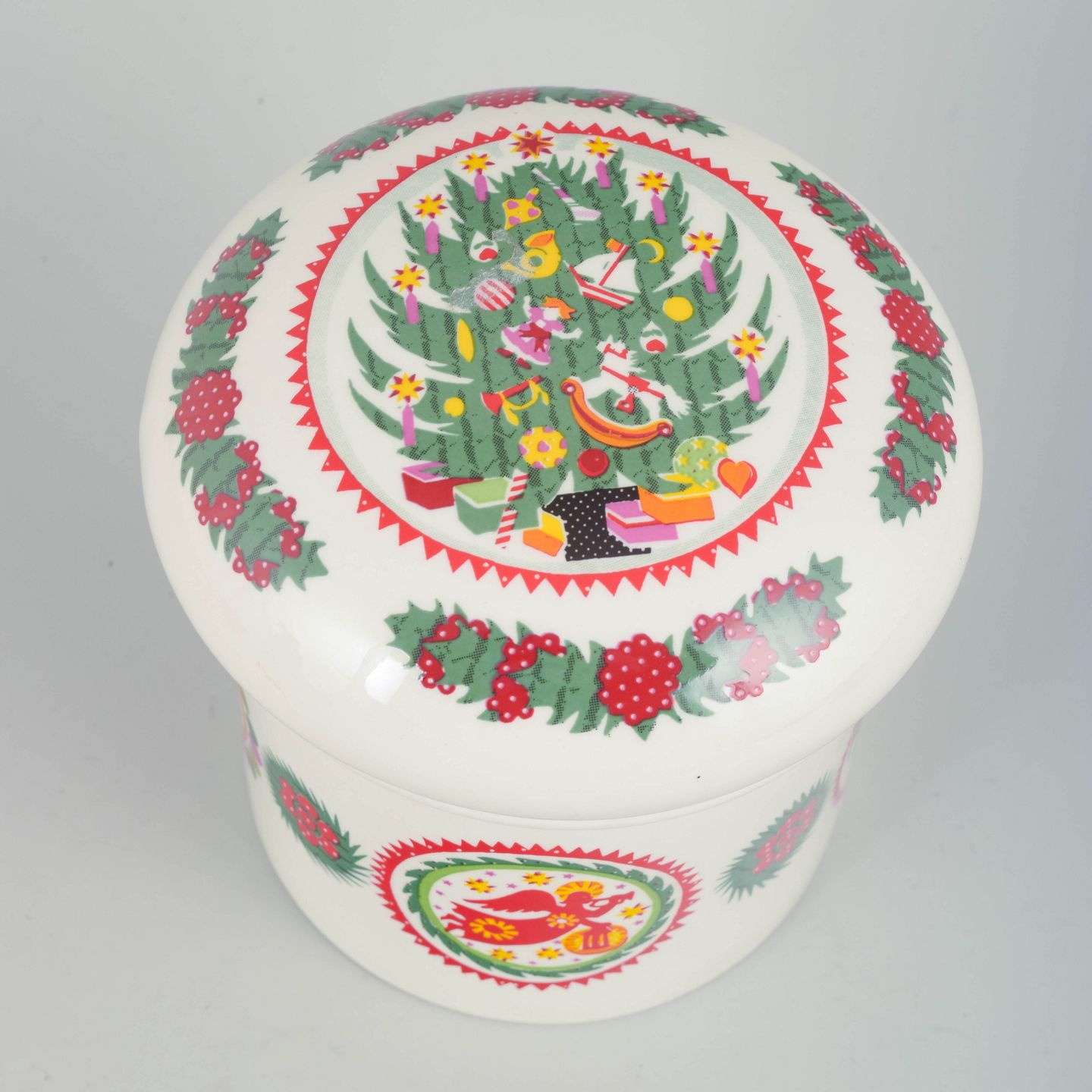 Susan Williams-Ellis for Portmeirion, lågkrukke.Cylindrisk lågkrukke i fajance med farverig juledekoration i rød-, grøn- og gule toner på lys bund. Dekoreret med stiliserede julemotiver, herunder engel- og blomsterornamentik i cirkulære medaljoner, samt krans- og kristtornborter. Låget har let hvælvet form med gennemgående dekoration, der matcher krukkens sider.
