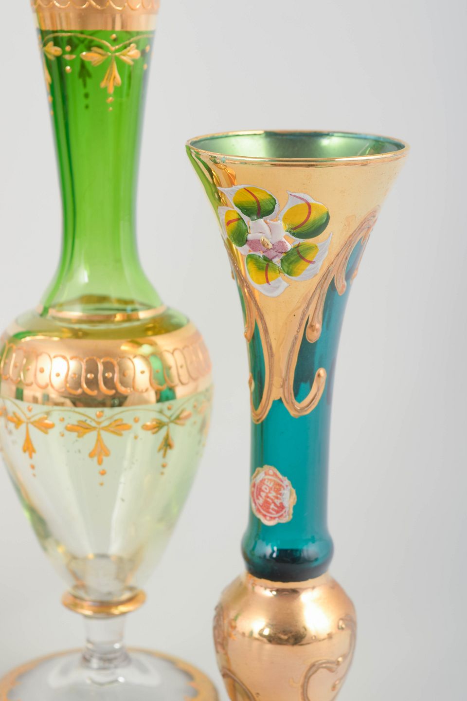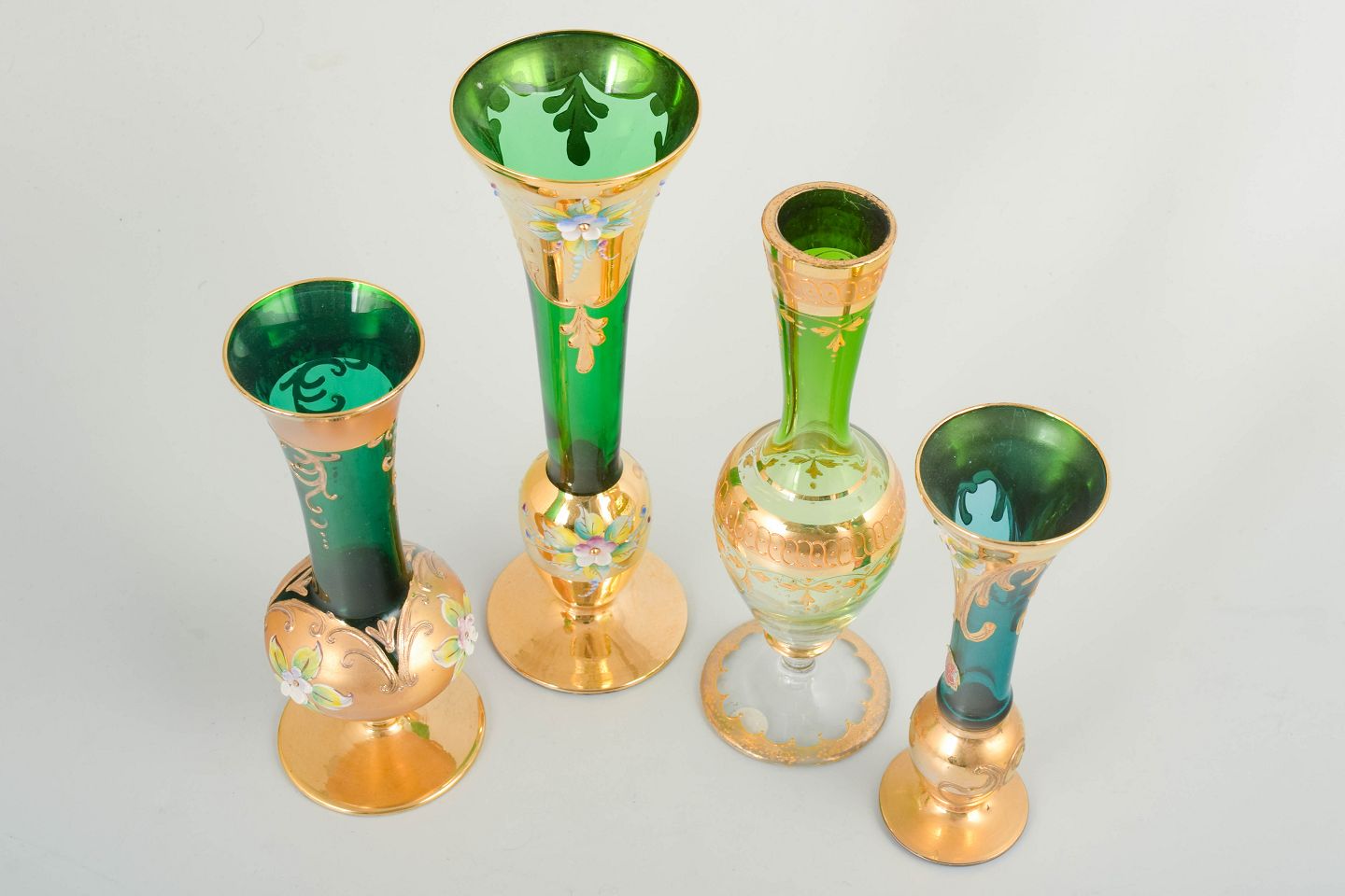 Bøhmisk glas, sæt på fire vaser.Sæt med fire slanke vaser i grønt glas med rig guldfarvet dekoration og emaljemalede blomster. Håndlavet arbejde med varierende former og størrelser, udført i Bøhmen.
