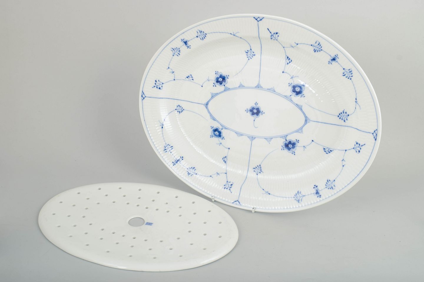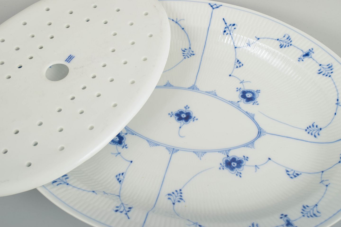 Royal Copenhagen, Musselmalet riflet fiskefad med tilhørende fiskerist.Fiskefad i porcelæn dekoreret i Musselmalet riflet med håndmalet underglasurblå blomster og ranker. Sættet består af en gennemhullet indsats og et tilhørende rundt fad, udført efter Royal Copenhagens model 1/101.