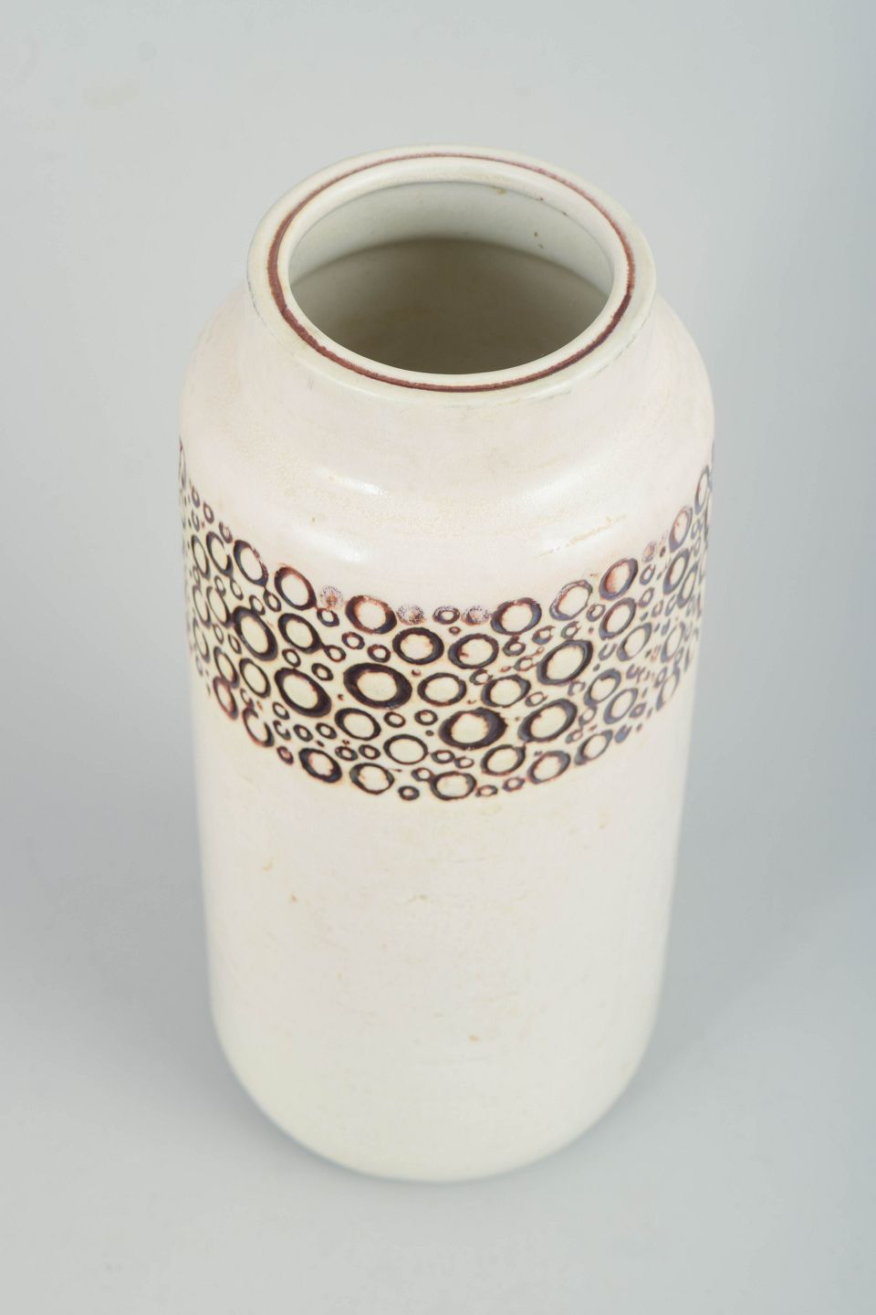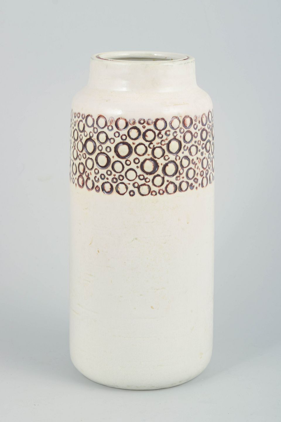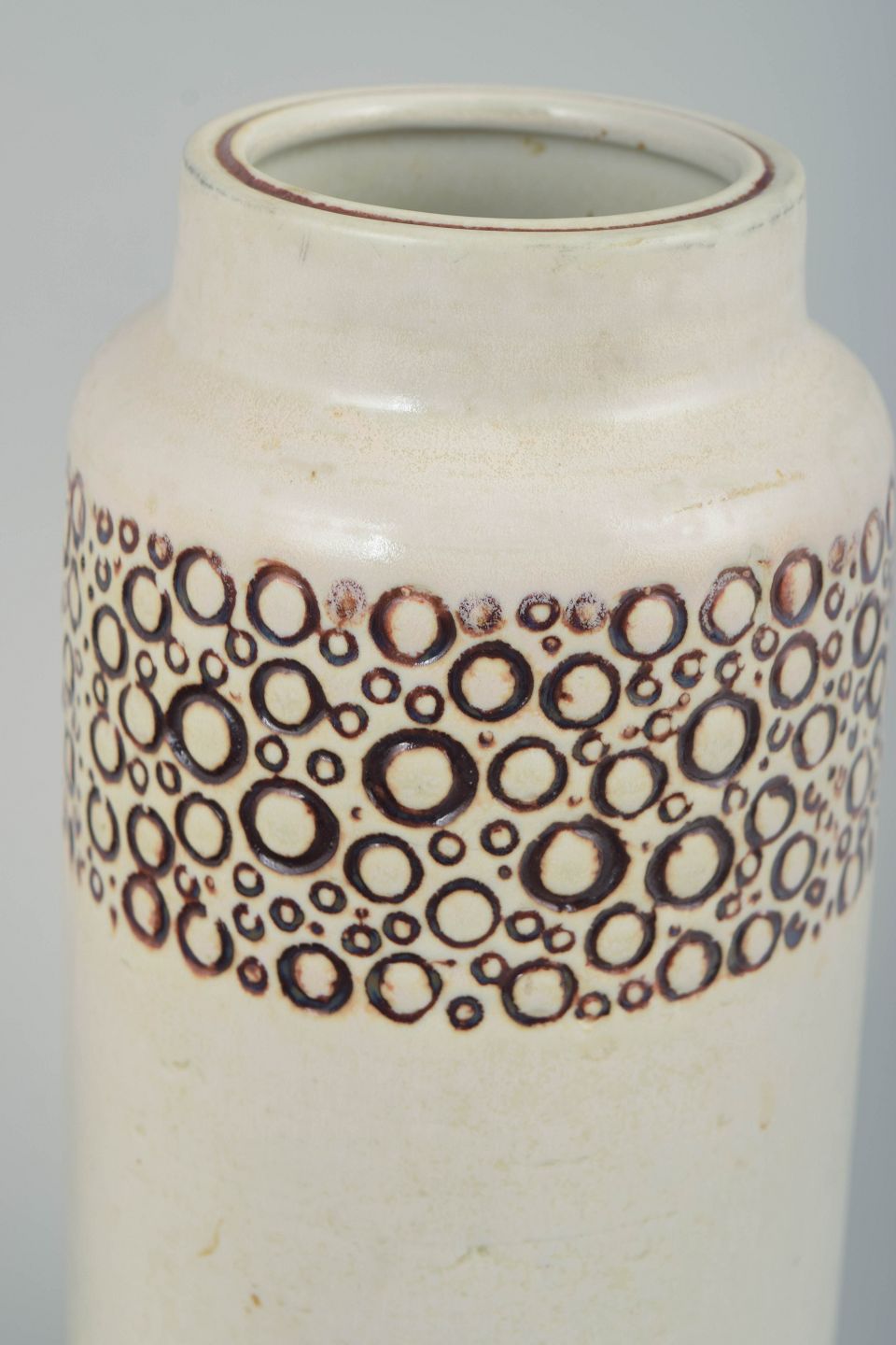 Lisa Larson for Gustavsberg, vase.Cylinderformet vase i glaseret stentøj med hvid bund og dekorativ bånddekoration af brune cirkulære mønstre omkring skulderen. Enkelt og grafisk formsprog, typisk for Lisa Larsons produktion hos Gustavsberg i 1970’erne. Modellen indgår i Gustavsbergs dekorative stentøjsproduktion fra perioden.