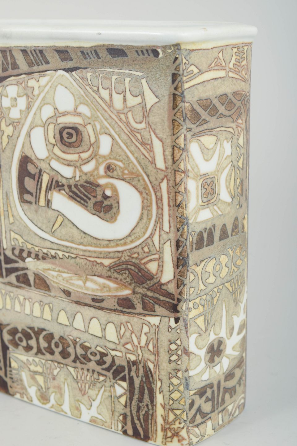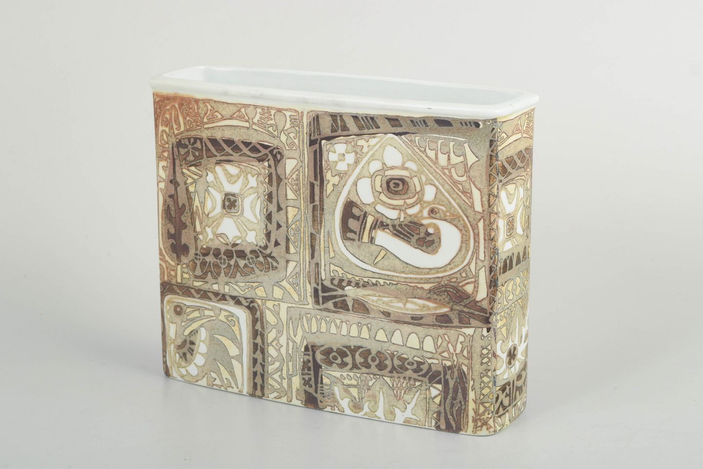 Nils Thorsson for Royal Copenhagen, vase.Rektangulær vase i fajance med reliefdekorerede felter og karakteristisk geometrisk ornamentik i afdæmpede jordfarver og lyse kontraster. Vasen er udført i Nils Thorssons velkendte formsprog fra Baca-serien, med tydelig inspiration fra arkæologiske og grafiske motiver. Overfladen har en markant taktil struktur, hvor dekorationen er integreret i formen og skaber et harmonisk helhedsudtryk. Model 719/2942.
