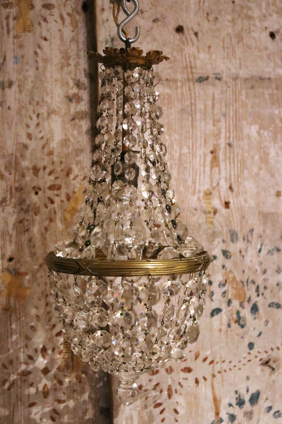 Gammel , mini prismelysekrone i bronze med klare slebne glas prismer.Lysekronen har en lyskilde i midten og er monteret med ny stofledning.