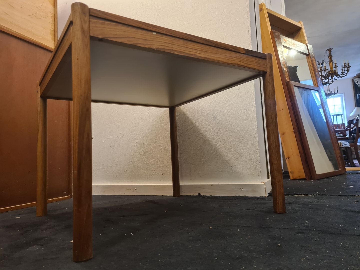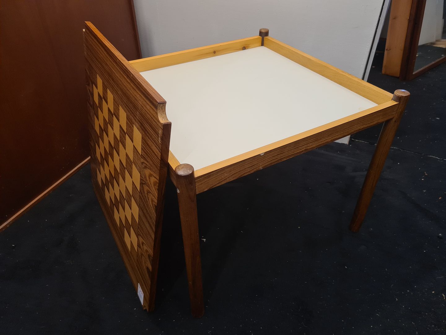 Kvadratisk skakbord i palisander fremstillet hos Georg Petersens møbelfabrik i 1970'erne. Fremstår pænt, velholdt og udmærket funktionsdygtigt. Højde 49 cm. Længde 60 cm. Bredde 60 cm.