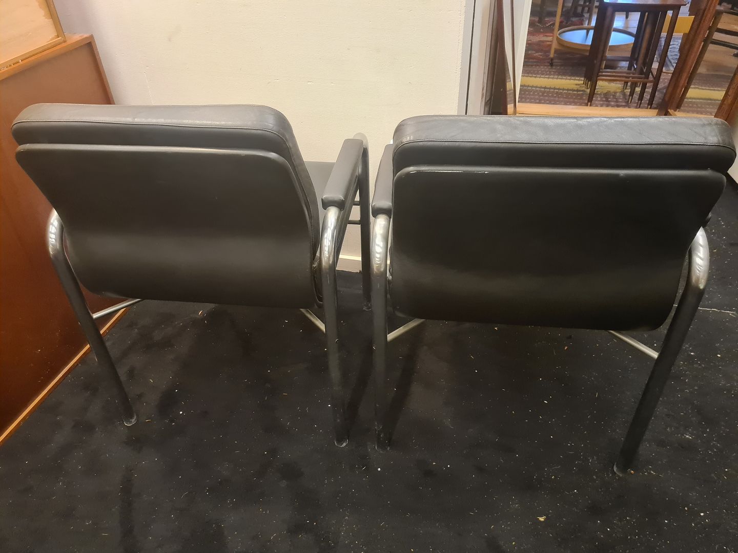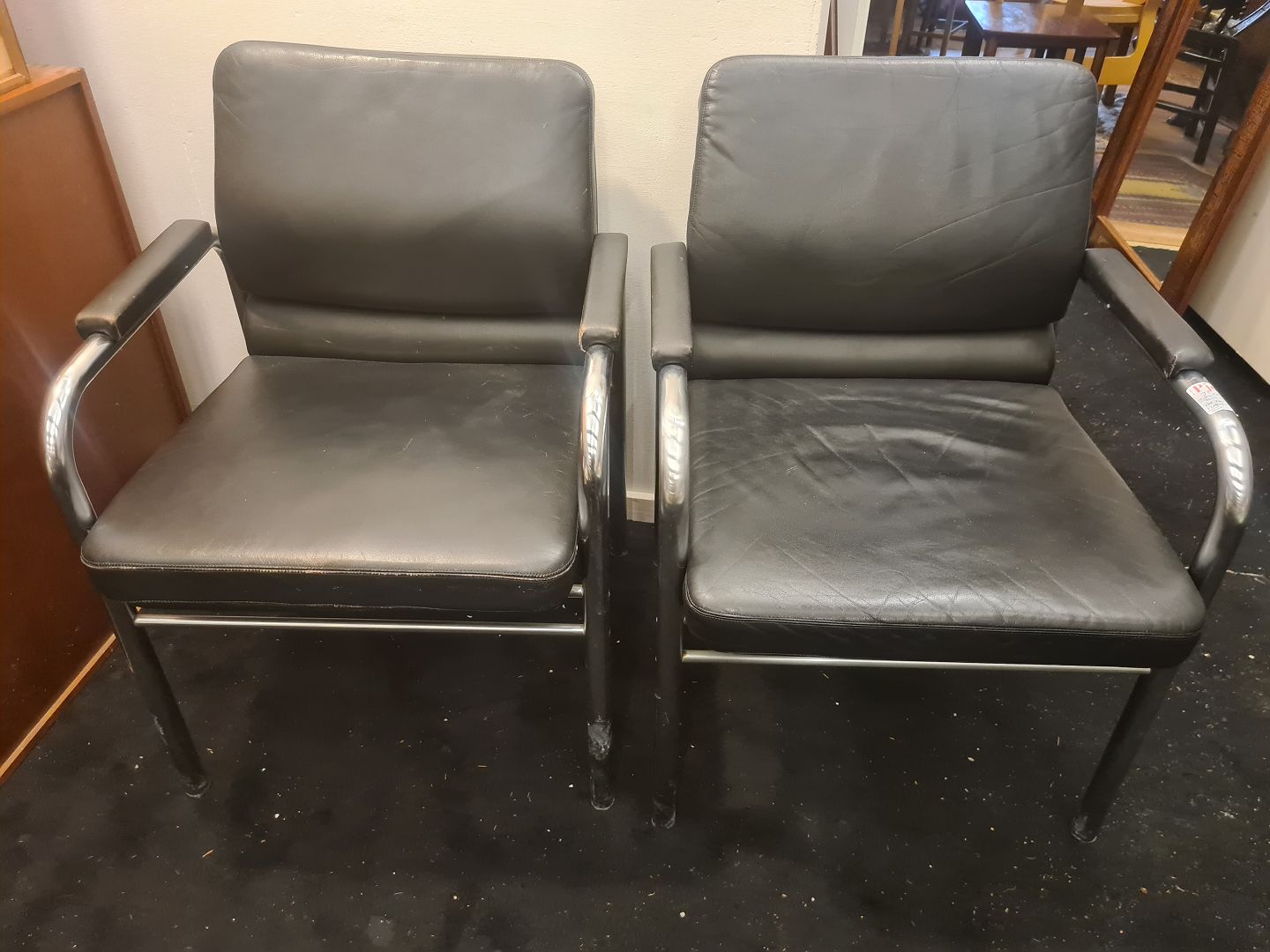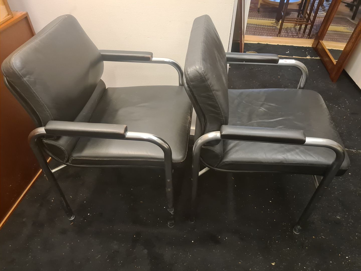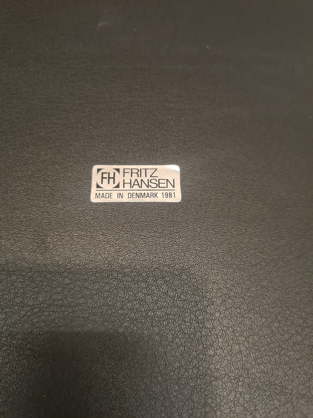 Par armstole produceret hos Fritz Hansen i 1981. Fremstillet i stål og læder. Fremstår gode og stabile dog med lidt overfladiske brugsspor på den ene på sæde og armlæn. (Billede)Højde 80 cm. Bredde 58 cm. Dybde 60 cm.