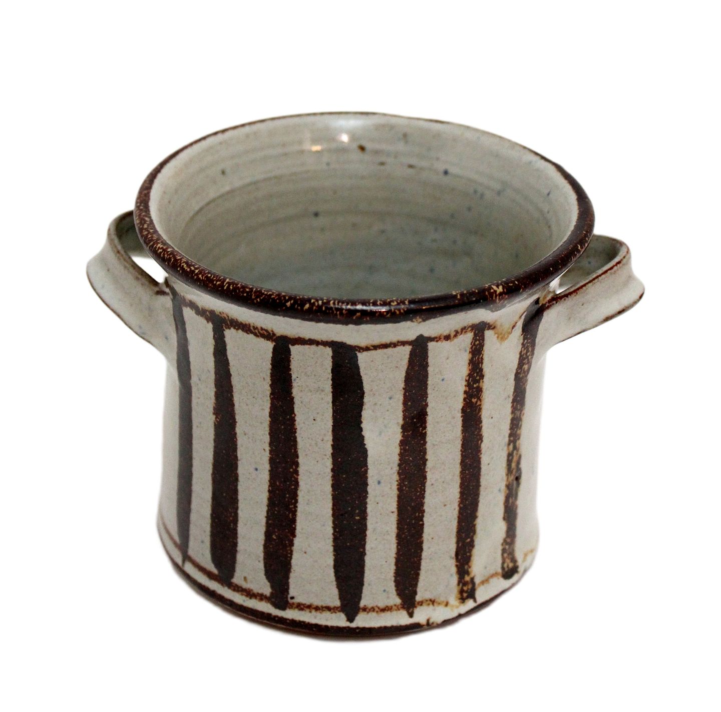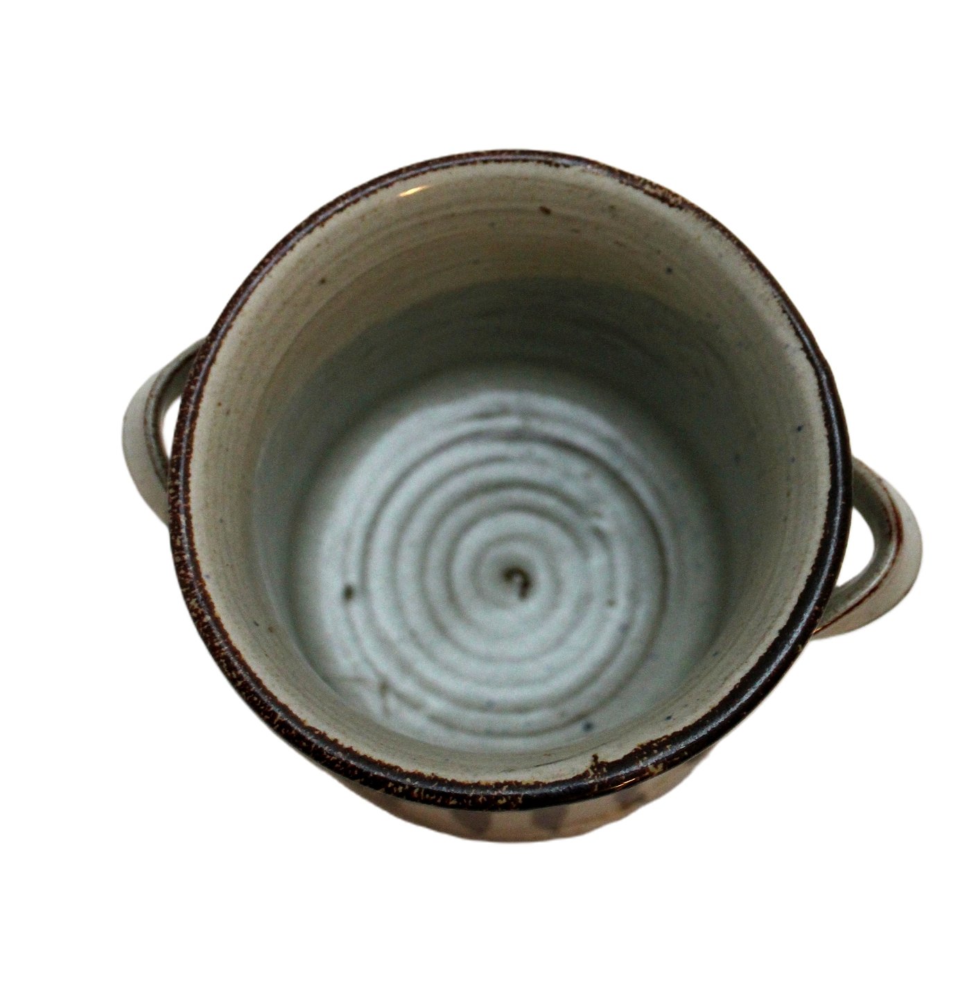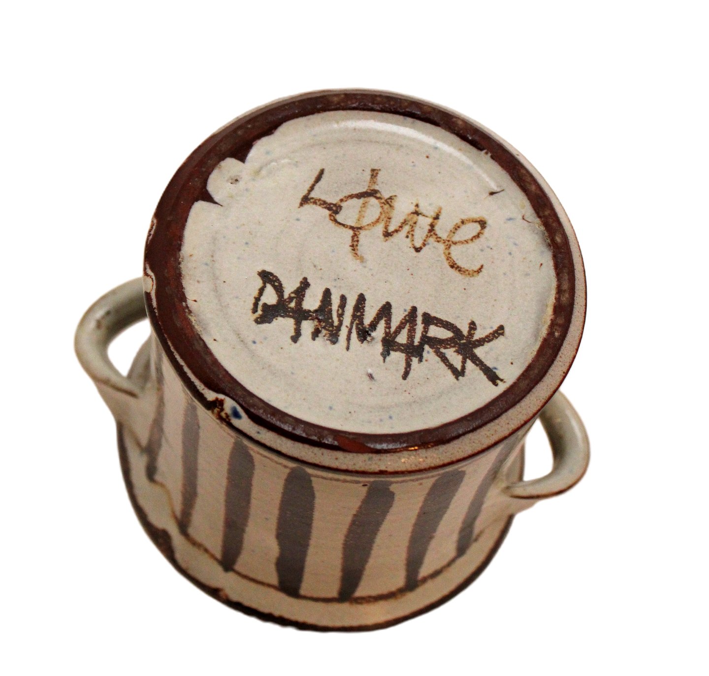 Svend Løwe, København, eget værksted grundlagt i 1954. Krukke eller urtepotteskjuler med ører. Højde 9,5 cm. Diameter 10 cm. Signeret Løwe Danmark. Pris: 250 kr.