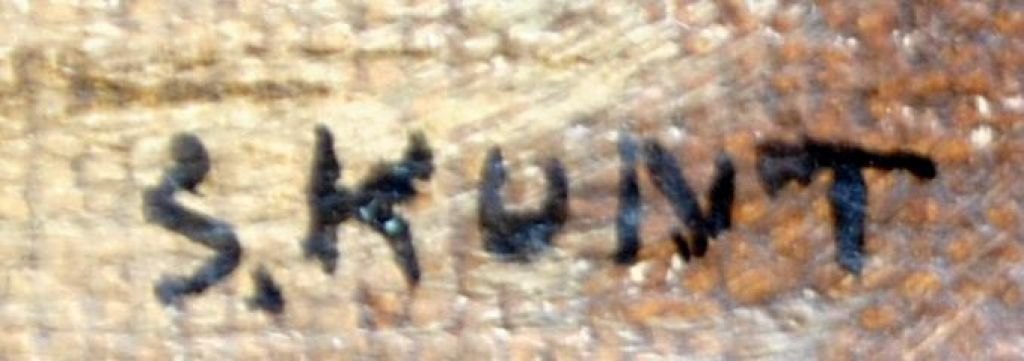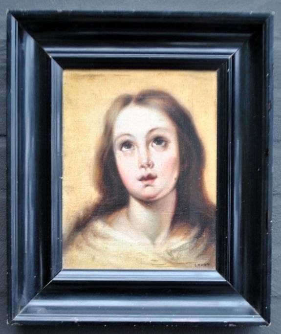 Kunt, S. (19. Jahrhundert): Das Gesicht einer Jungfrau. Öl auf Leinwand. Signiert. 27 x 20,5 cm.Detailkopie von Bartolemi Esteban Murilles Werk „La conception“ im Prado-Museum, Madrid.