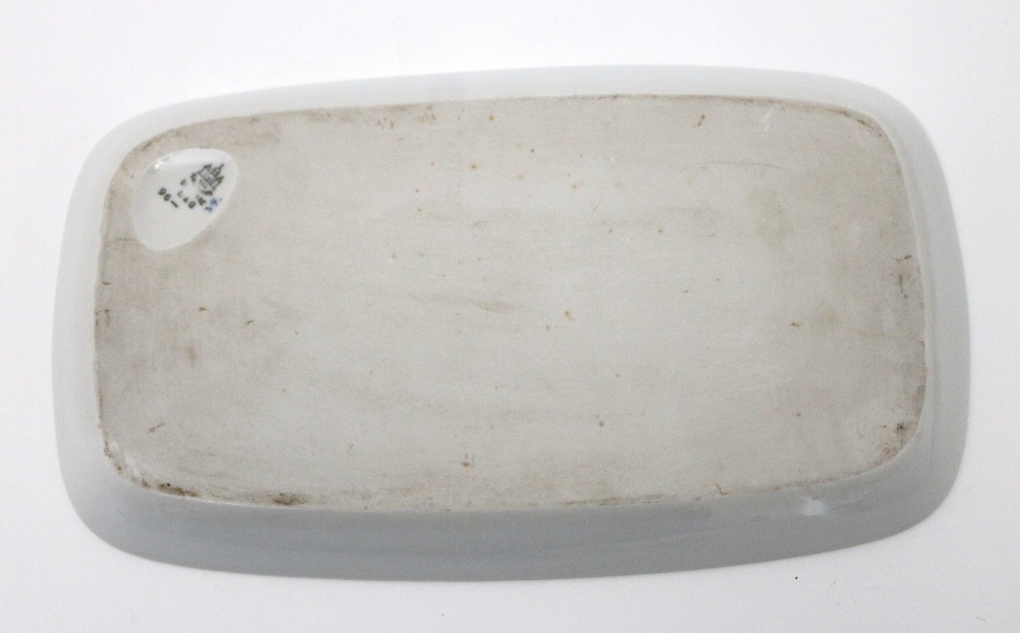 Bing & Grøndahl, Empire, hvidt porcelæn med blå ranker.Aflang bakke til sukker og fløde. Kan bruges som serveringsfad eller spisetallerken. Nr. 96. II. sortering. Fin stand. 27 x 15,5 cm. Pris: 250 kr.