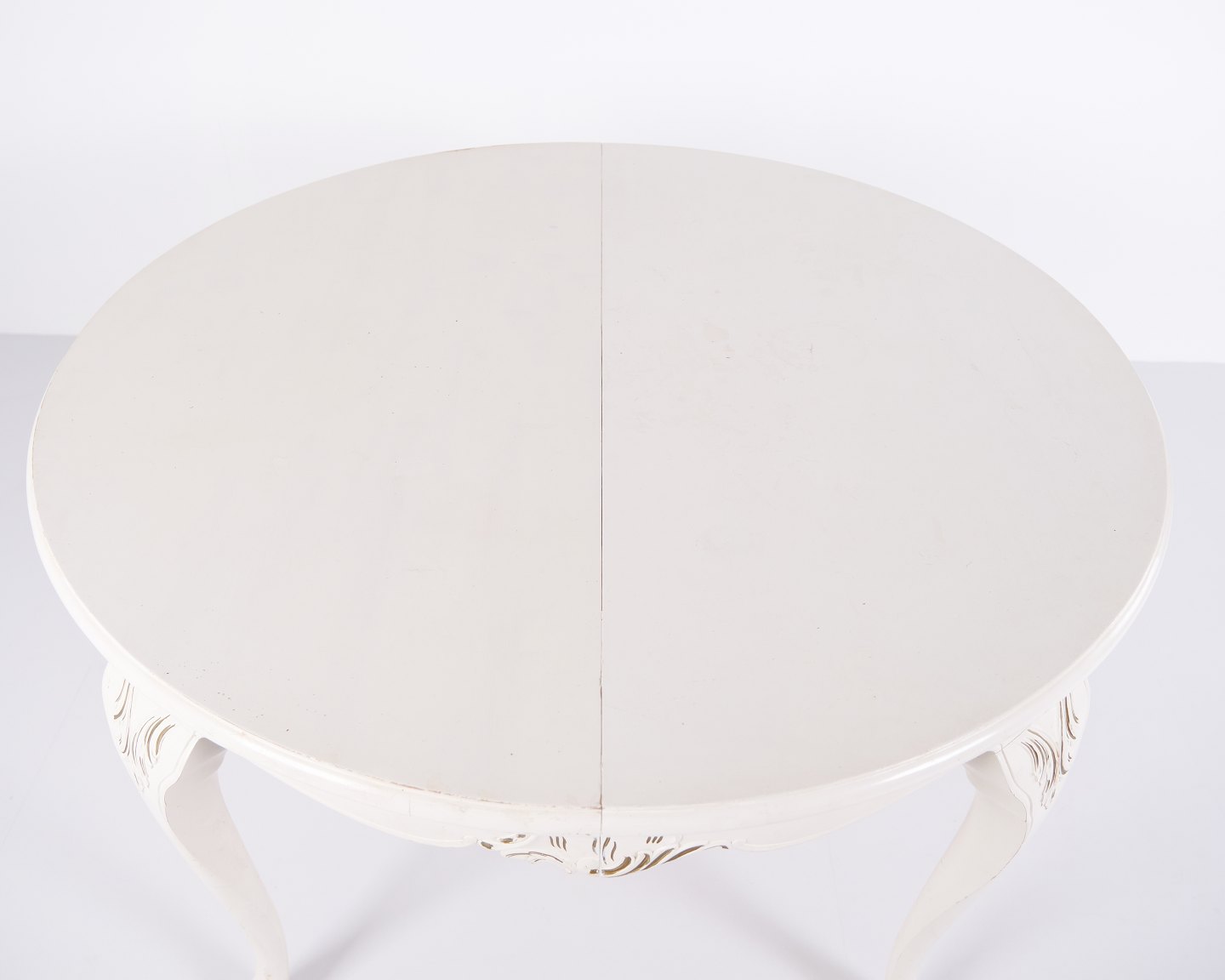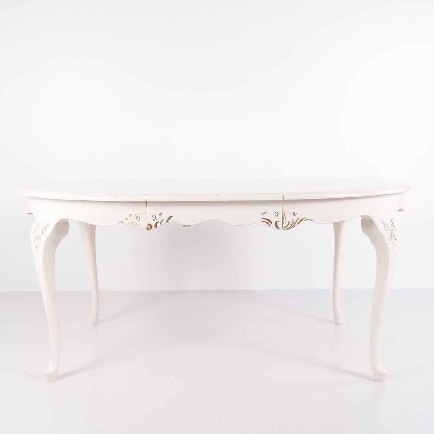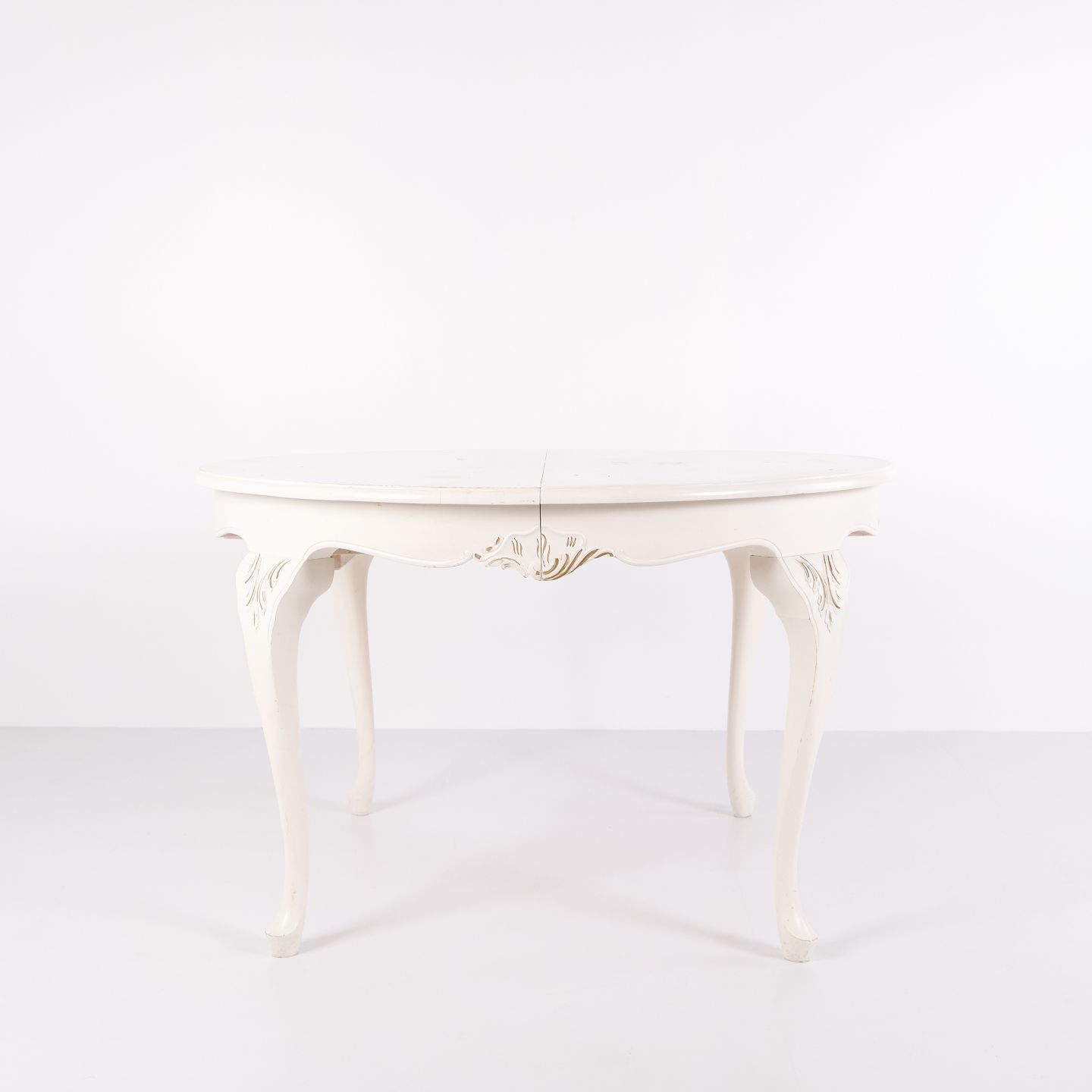 Antiker runder Esstisch im Neu-Rokoko Stil aus den 1920er Jahren. Weiß lackiert mit dekorativen Details und 4 Einlegeplatten.— Stil: Neu-Rokoko